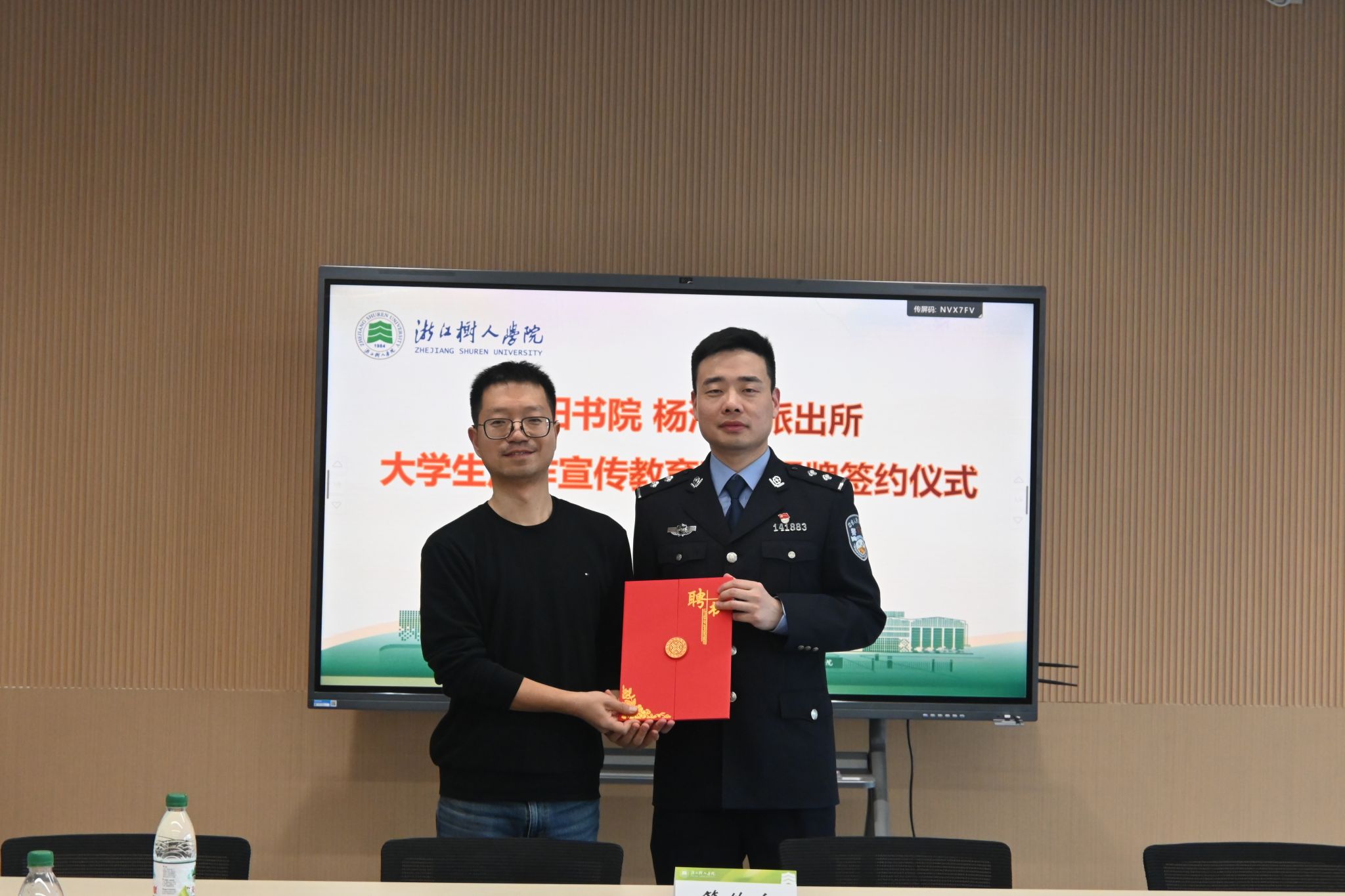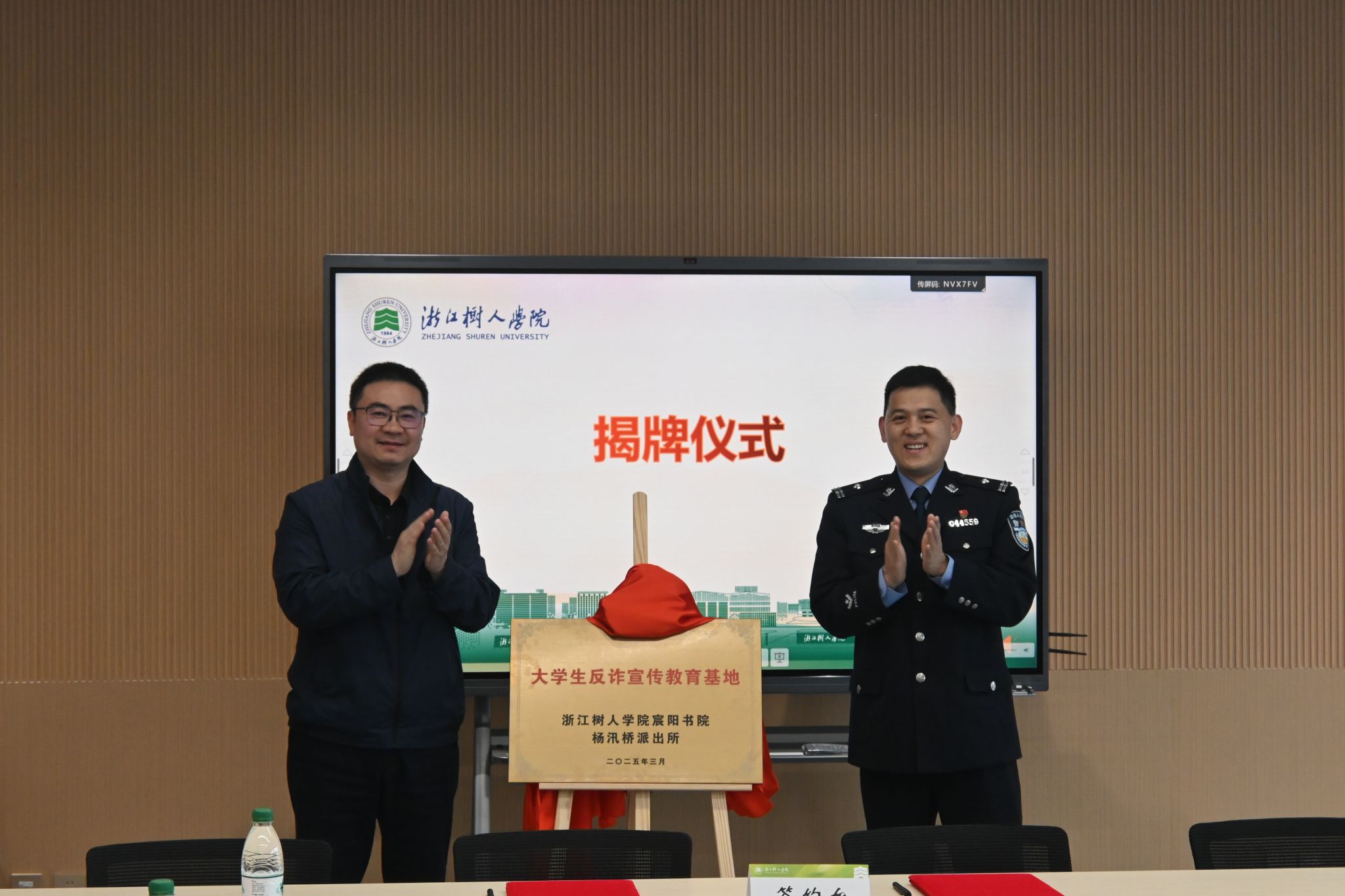 3月26日下午,宸阳书院与杨汛桥派出所在树人之家党员之家举行大学生反诈宣传教育基地揭牌签约仪式。校长助理冯淑娟,安保部部长吴杨铠,杨汛桥派出所所长张丹波、副所长王汉斌等出席,仪式由书院常务副院长王伟君主持。此次揭牌签约仪式标志着绍兴市第一个反诈宣传教育基地成立,这也是绍兴市第一个警校共建反诈宣传教育基地。