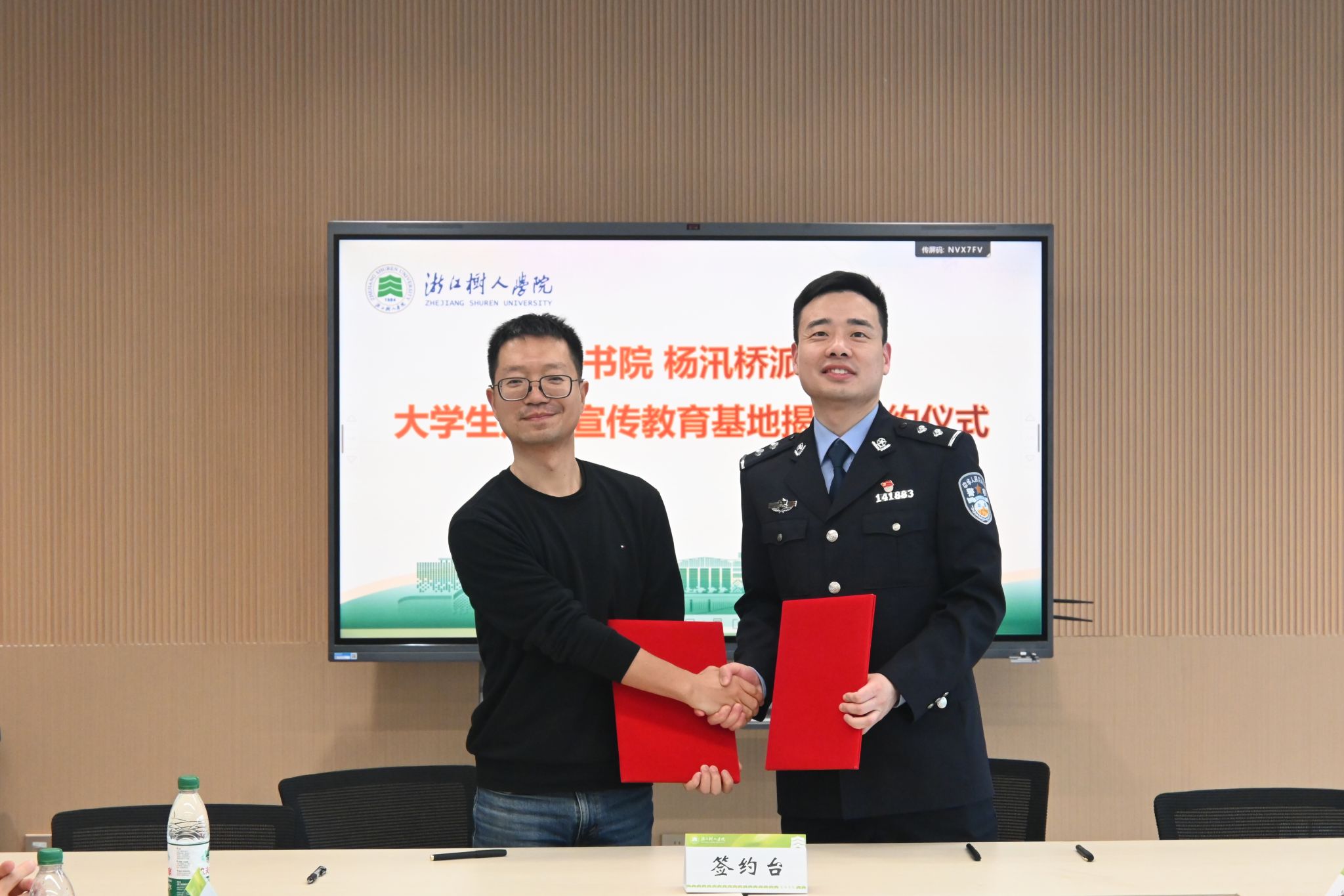 王伟君与王汉斌签署了宸阳书院-杨汛桥派出所大学生反诈宣传教育基地共建协议。
