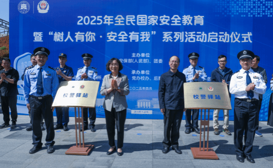 活动现场,辖区公安分局领导和学校领导共同为两校区“校警驿站”揭牌,王军为首批入驻“校警驿站”专兼职工作人员代表颁发聘书。2022级环境工程专业郑昕怡同学代表全校学生宣读校园安全文明倡议书。