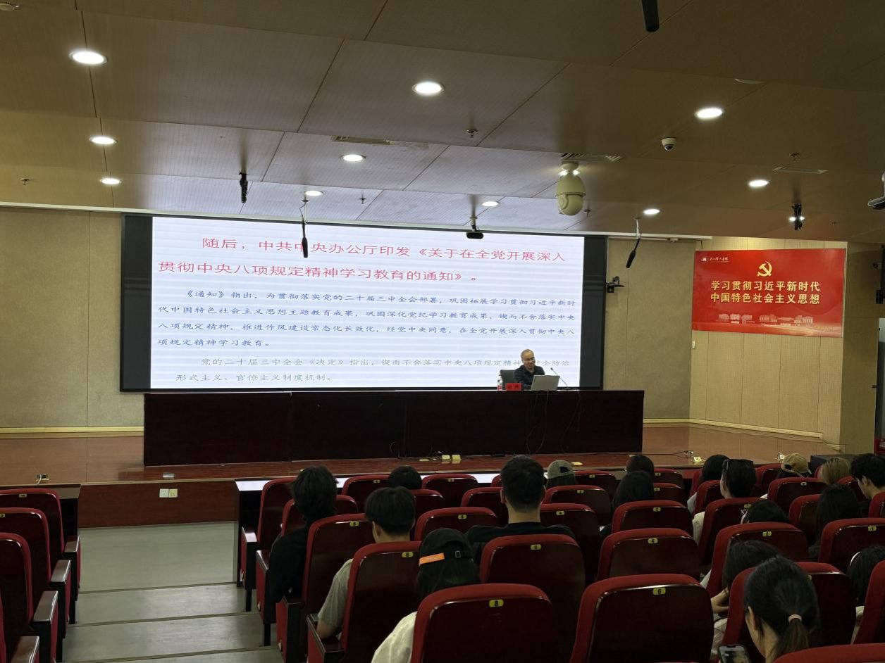 俞老师首先从党的作风建设方面向大家详细介绍了中国共产党作风建设的发展历史。他用一个个违反党的作风建设的鲜活案例,带领大家深刻地认识到,党的作风就是党的形象,关系人心向背,关系党的生死存亡。随着中国特色社会主义进入新时代,2012年12月4日,中共中央政治局召开会议,审议通过《中央政治局关于改进工作作风、密切联系群众的八项规定》,更加巩固了党的作风建设,把党的作风建设的“金名片”越擦越亮。