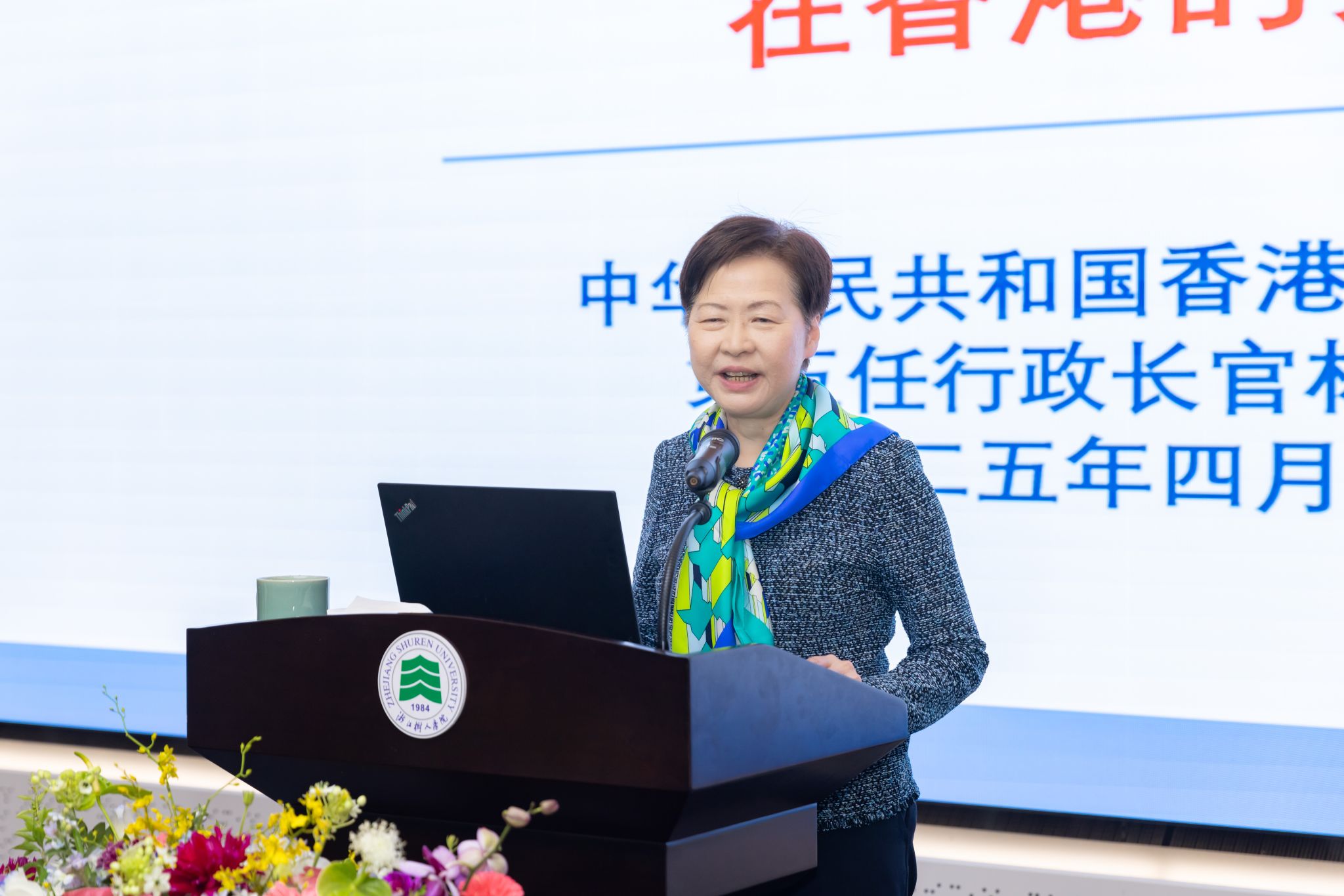4月18日,香港特别行政区第五任行政长官林郑月娥到访永利官网杭州拱宸桥校区,在查济民大厦为近200名师生带来《坚持和完善“一国两制”在香港的实践》主题演讲。