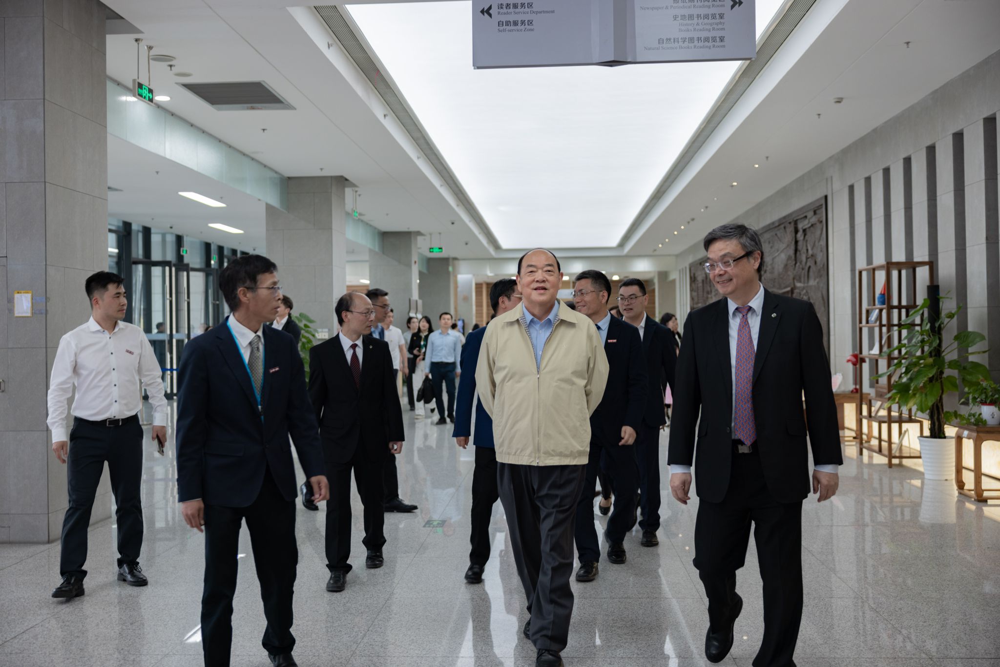 贺一诚在李鲁的陪同下考察校园。39年前,贺田先生以赤子之心助力学校创建;24年前,贺一诚代表父亲贺田先生来校,捐赠扩建图书馆。看到如今两校区共四万平米的图书馆,拥有四库全书馆与政协委员图书馆等特色空间与藏书规模,贺一诚连连说“好”。