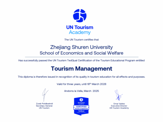 2025年3月,联合国旅游组织旅游教育质量认证中心正式公布认证结果,我院旅游管理专业、会展经济与管理专业通过联合国世界旅游组织旅游教育质量国际认证(UN Tourism.TedQual Certification),认证得分788分(满分845分,得分率93%),以优秀等级获得长达三年年限的国际认证(2025年3月18日至2028年3月18日)。