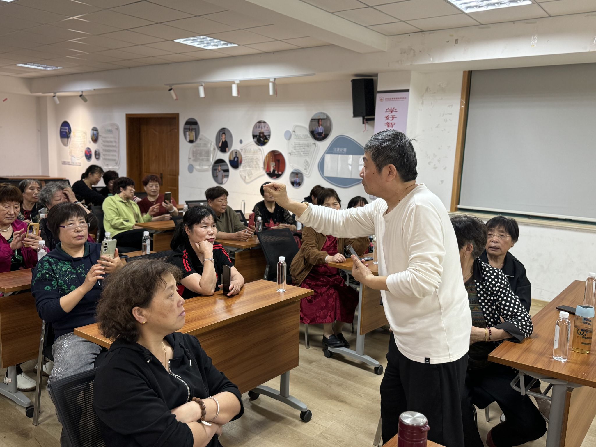 揭牌仪式结束后,开展了送教下乡活动。送教活动包括《手机摄影技术》和《养生保健操》两门课程,分别由姜红教授和俞慧燕副教授授课。课程内容丰富实用,授课形式生动有趣,受到了当地摄影爱好者、社工和中老年群体的热烈欢迎。