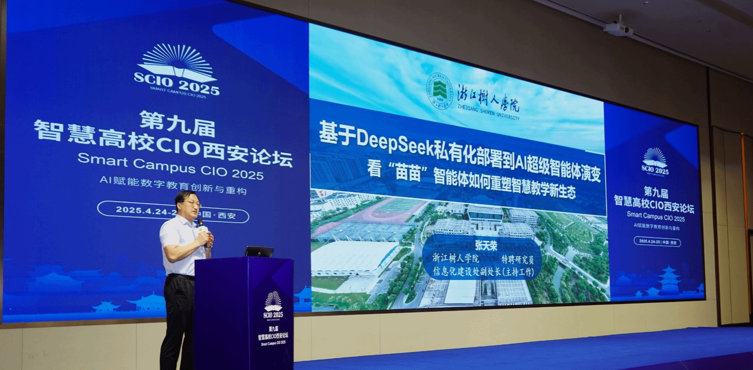 会上张天荣作了题为《“从 DeepSeek 私有化部署到 AI 智能体全面落地——看“苗苗”智能体如何重塑智慧教学新生态》的主旨报告。介绍了学校的概况、AI+方案与规划,指出AI在高校的核心价值所在。重点介绍了永利官网智能体和AI+教学创新应用的建设经验,从一课一库、一课agent、一师一空间、一生一画像、智能体广场等角度进行汇报,得到了与会人员的高度肯定。