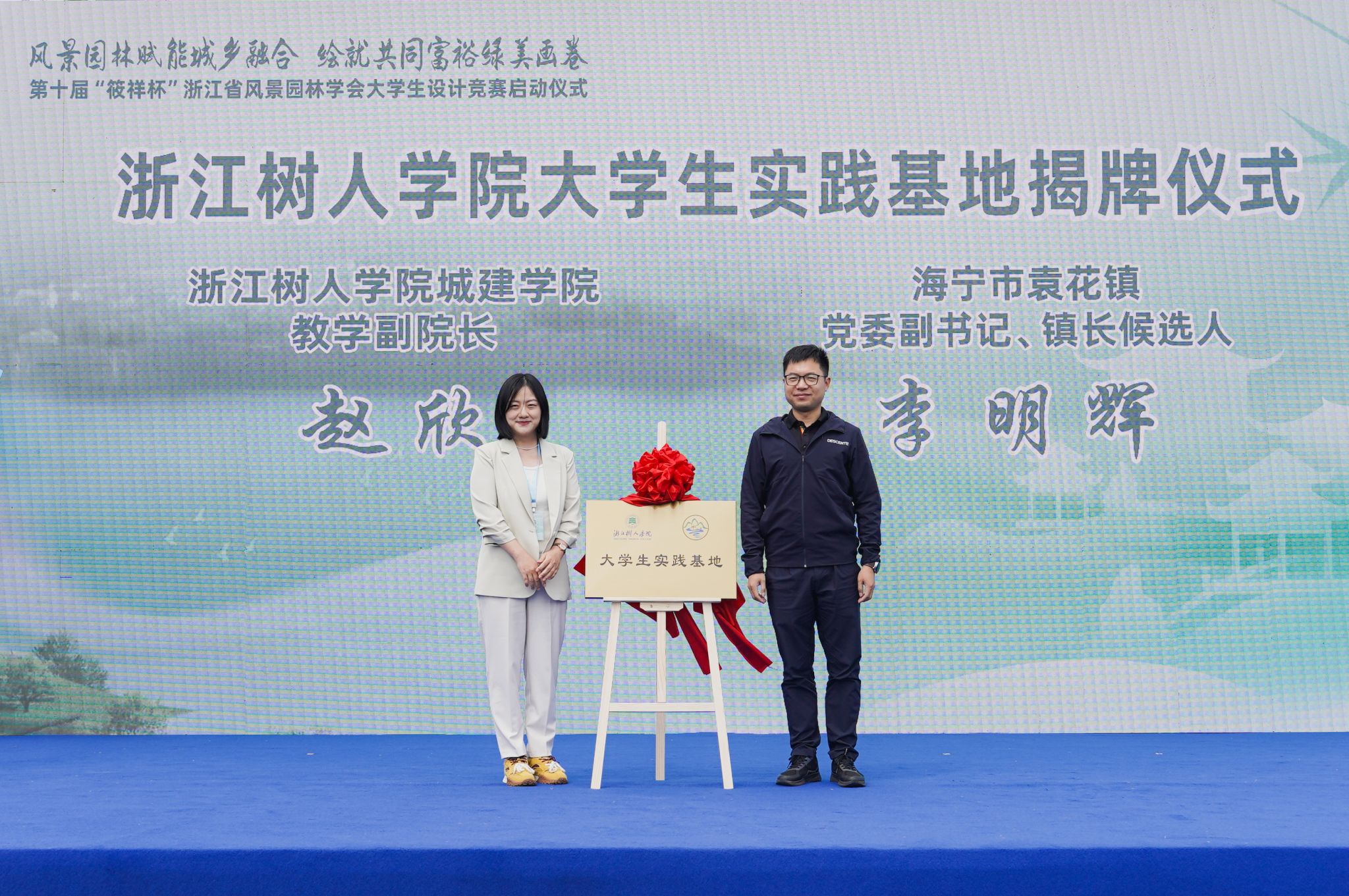 仪式现场还举行了304永利集团官网与袁花镇共建大学生实践基地揭牌仪式。随着“大学生实践基地”的落地,标志着304永利集团官网与袁花镇的合作迈入新阶段。未来,双方以竞赛为契机,在生态修复、文旅开发、传统村落保护等领域开展产教研实践合作,探索城乡融合发展的创新路径,助力乡村振兴。