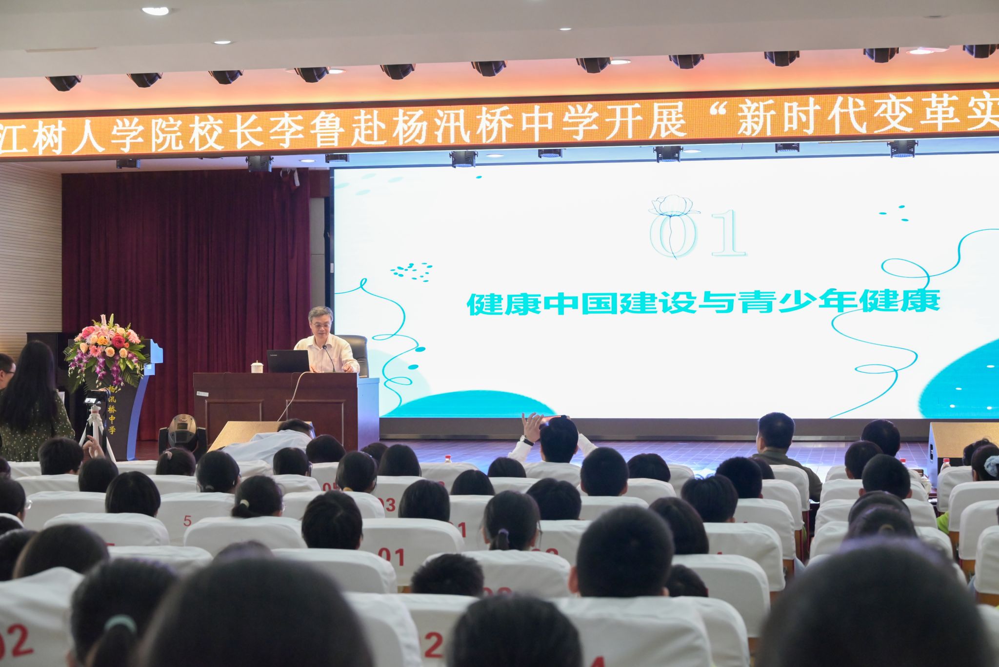 为深入贯彻落实新时代教育改革精神,推动育人模式创新实践,4月28日,校长李鲁教授赴杨汛桥中学,以《健康中国,从我做起》为题,为七年级学生带来了一场生动的“新时代变革实践”大思政课。柯桥区委教育工委专职副书记、区教体局党委副书记、副局长钱春风,杨汛桥中学书记、校长吴红红等出席活动。