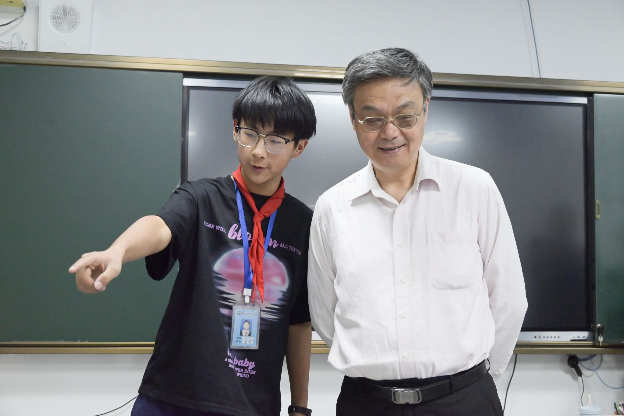 宣讲前,在吴红红的陪同下,李鲁校长一行漫步中学校园,考察校园学农基地,参观师生书画与科技作品,与同学们亲切交流。