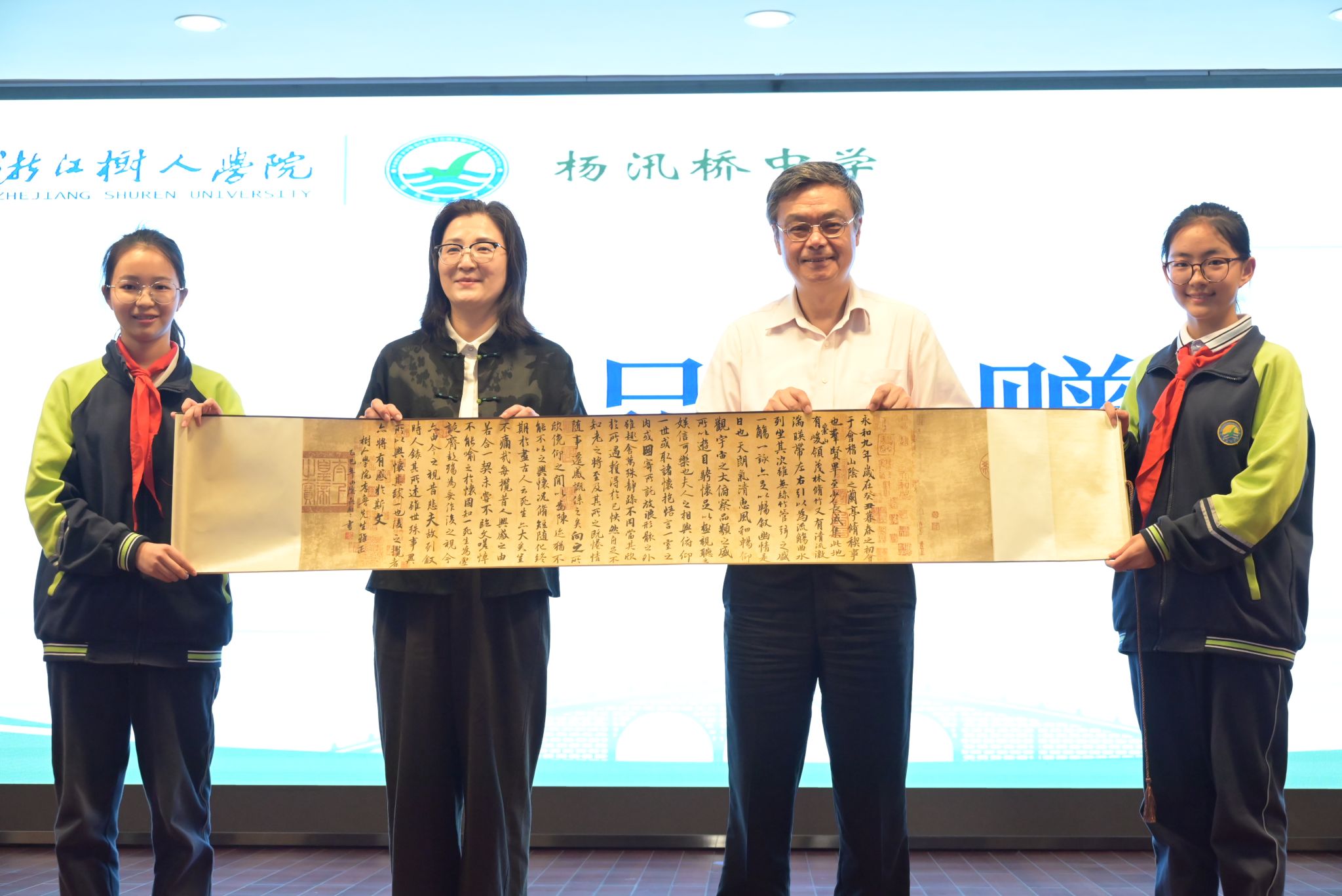吴红红向李鲁赠送其亲笔书写的《兰亭序》书法长卷。李鲁向吴红红回赠学校苗绣作品。