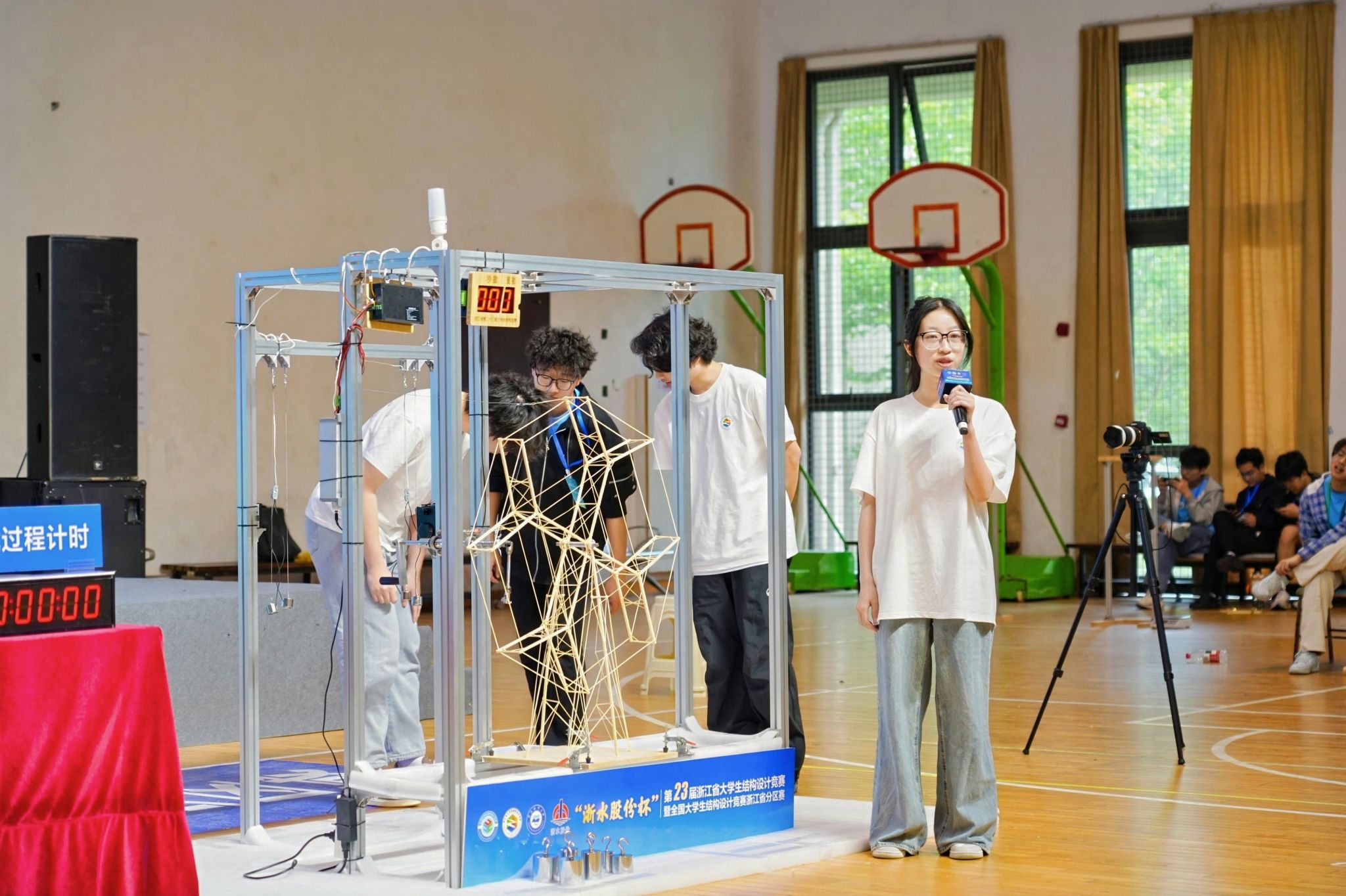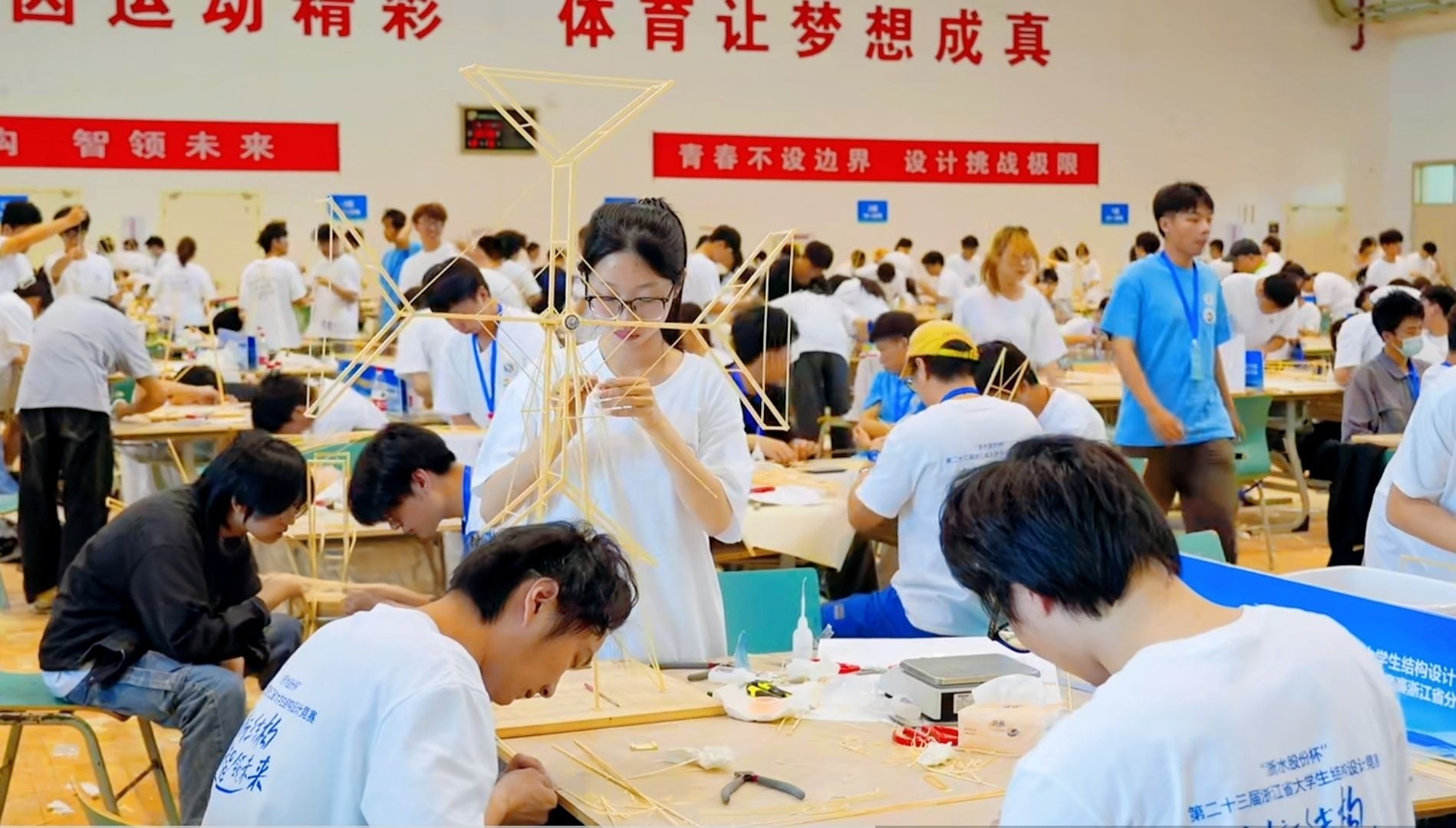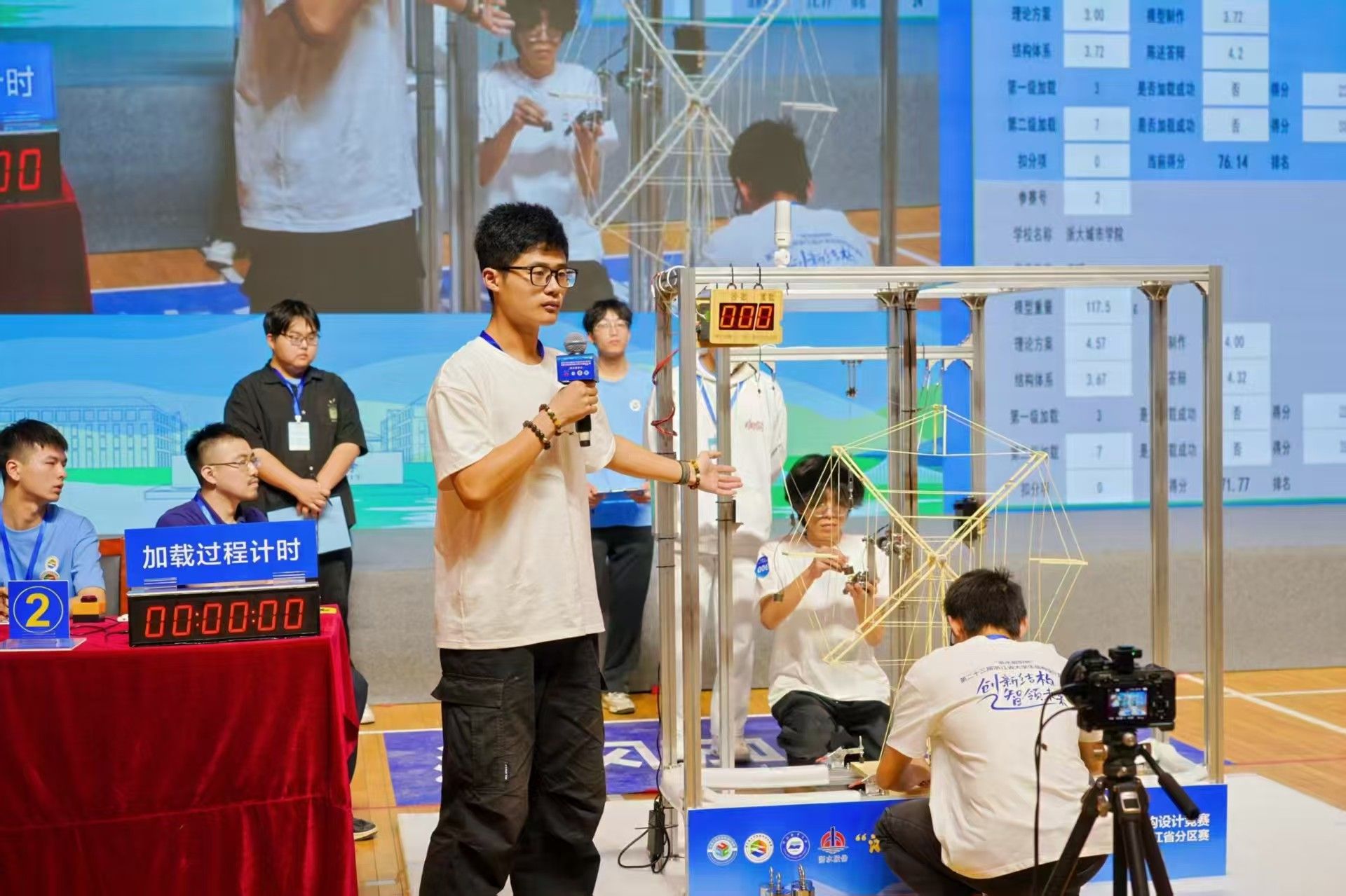 本次竞赛的主题是“摩天轮结构设计与模型制作”,比赛要求参赛选手用规定的竹材和工具在10小时内制作一个缩小版摩天轮,并测试其在极端风荷载作用时和正常运行(不均匀负载)时的安全可靠性。比赛的具体环节包括理论方案设计、现场模型制作、陈述与答辩、加载测试等,每一个环节都至关重要,尤其是最后的加载测试更是惊心动魄。永利官网的“旺旺雪饼”(队员:陈诗妍、徐嘉炫、张傅)和“开拓者队”(队员:王博增、陈怡浩、沈栋良)两支队伍,凭借精巧的设计创意和扎实的技术功底,团结拼搏,砥砺而行,赛出了“工匠”情怀,赛出了“树人”风采!