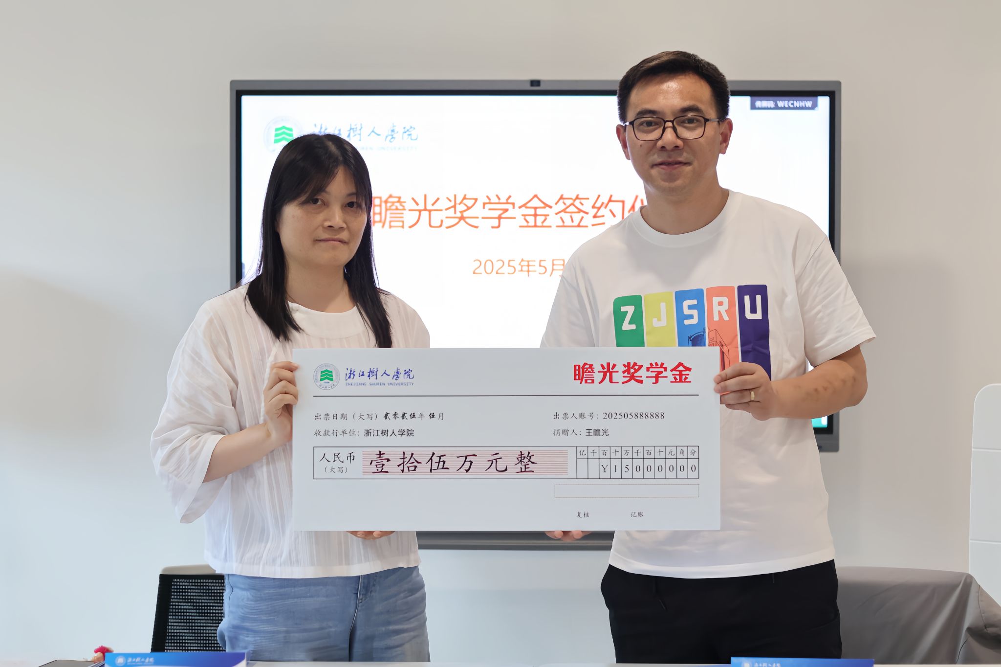 严伟伟在致辞中介绍了该奖学金的设立过程,由王瞻光女士发起,旨在支持母校人才培养,奖励在专业学习、社会实践或创新创业中表现突出的优秀大学生,每年评选不超过20人,每人资助1500-3500元,传递校友关怀与榜样力量。严伟伟赞扬了王瞻光女士的捐赠义举,称其展现了树人校友的社会责任感与饮水思源的心胸,并强调将严格管理奖学金使用,确保其发挥最大激励效应,同时继续加强校友联络,凝聚更多力量共促学校发展。在签约环节,王瞻光女士与校方代表共同签署捐赠协议,并递交象征性捐赠支票。校方向王女士颁发捐赠证书,对其情系母校、反哺教育的善举致以诚挚感谢。