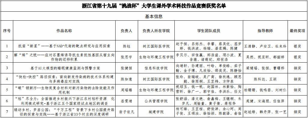 在省赛决赛中,荣获银奖的项目分别是树兰国际医学院/崇德书院《抗菌“新星”——基于NAD⁺代谢的靶点研究与应用探索》项目(负责人:陈钰,指导教师:王清静、卢安卫、杜来玲)、生物与环境工程学院/交叉科学研究院/崇德书院《解“烯”之忧——应对石墨烯诱导抗生素抗性基因从宿主向作物的迁移积累》项目(负责人:张思宇,指导教师:吴然、祝亚昕、都韶婷)。