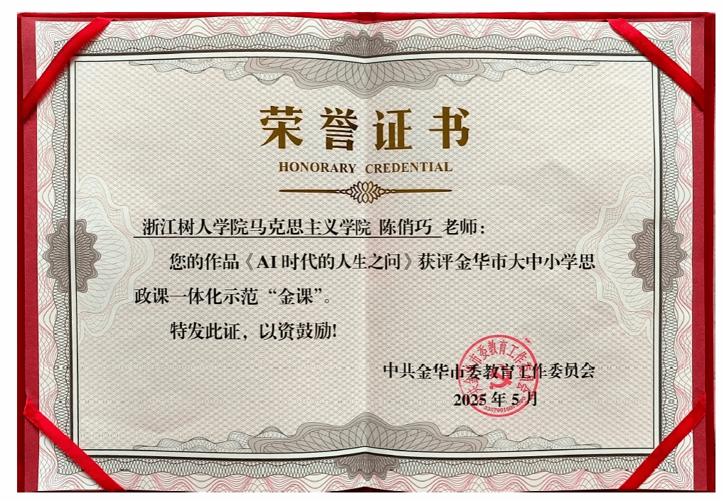 在同期开展的金华市“真理的味道望道薪传”大中小学思政课一体化示范“金课”评选活动中,马克思主义学院陈俏巧老师的作品《AI时代的人生之问》获评示范“金课”。该课程以人工智能发展为切入点,引导学生辩证思考科技伦理与人生价值,体现了思政课程随时代脉搏创新的鲜明特征,展现了永利官网教师在跨学段教学设计中的深厚功底。