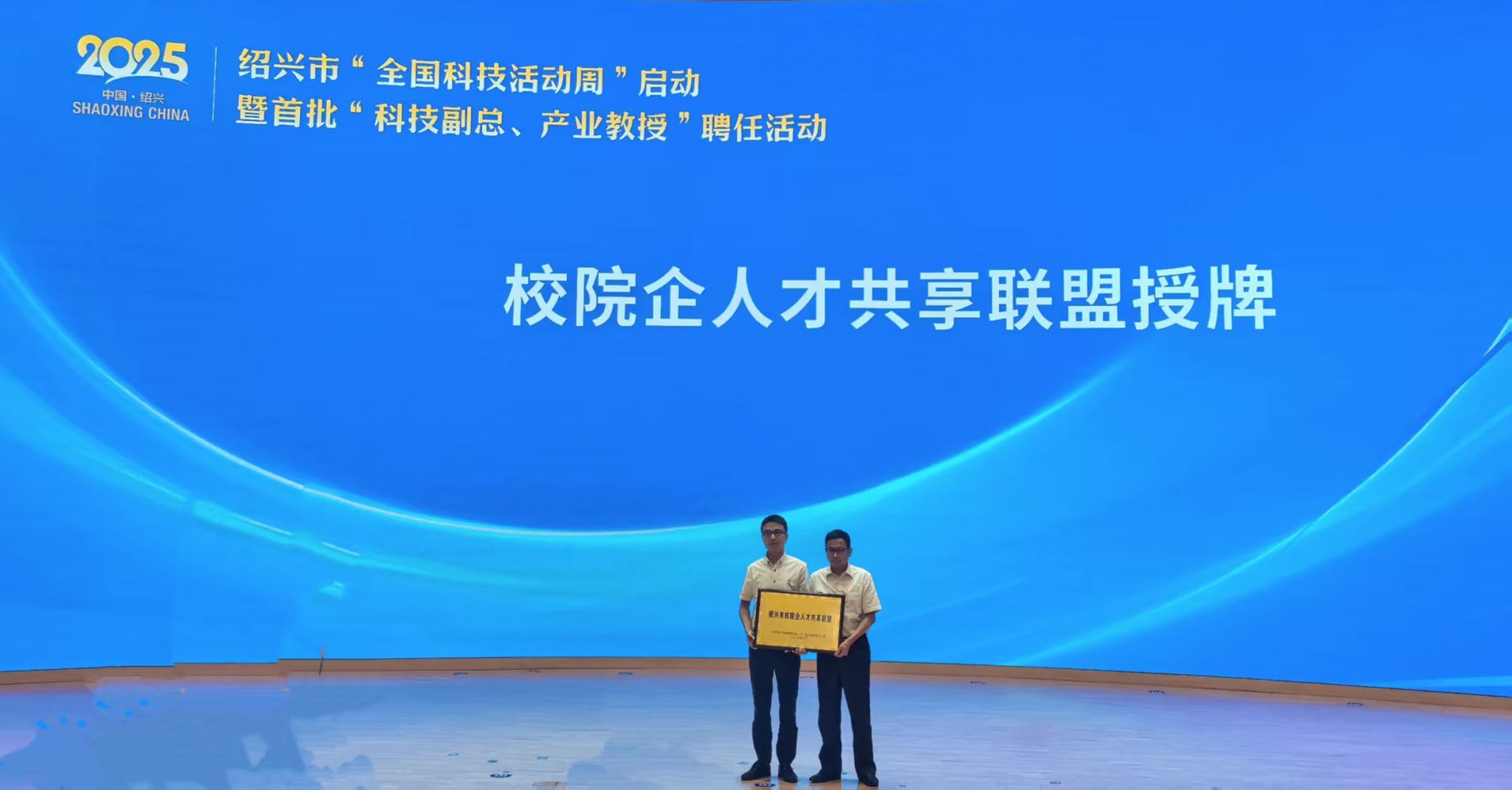 成立大会召开前,还举行了2025年绍兴市“全国科技活动周”启动暨首批“科技副总、产业教授”聘任活动,并进行了校院企人才共享联盟授牌仪式。绍兴市委常委、组织部部长谢国民,绍兴文理学院党委书记崔凤军出席活动并致辞,绍兴市政协党组成员、副主席王永明,市级有关部门负责人及相关企业、院校、高层次人才代表等150余人参加活动。
