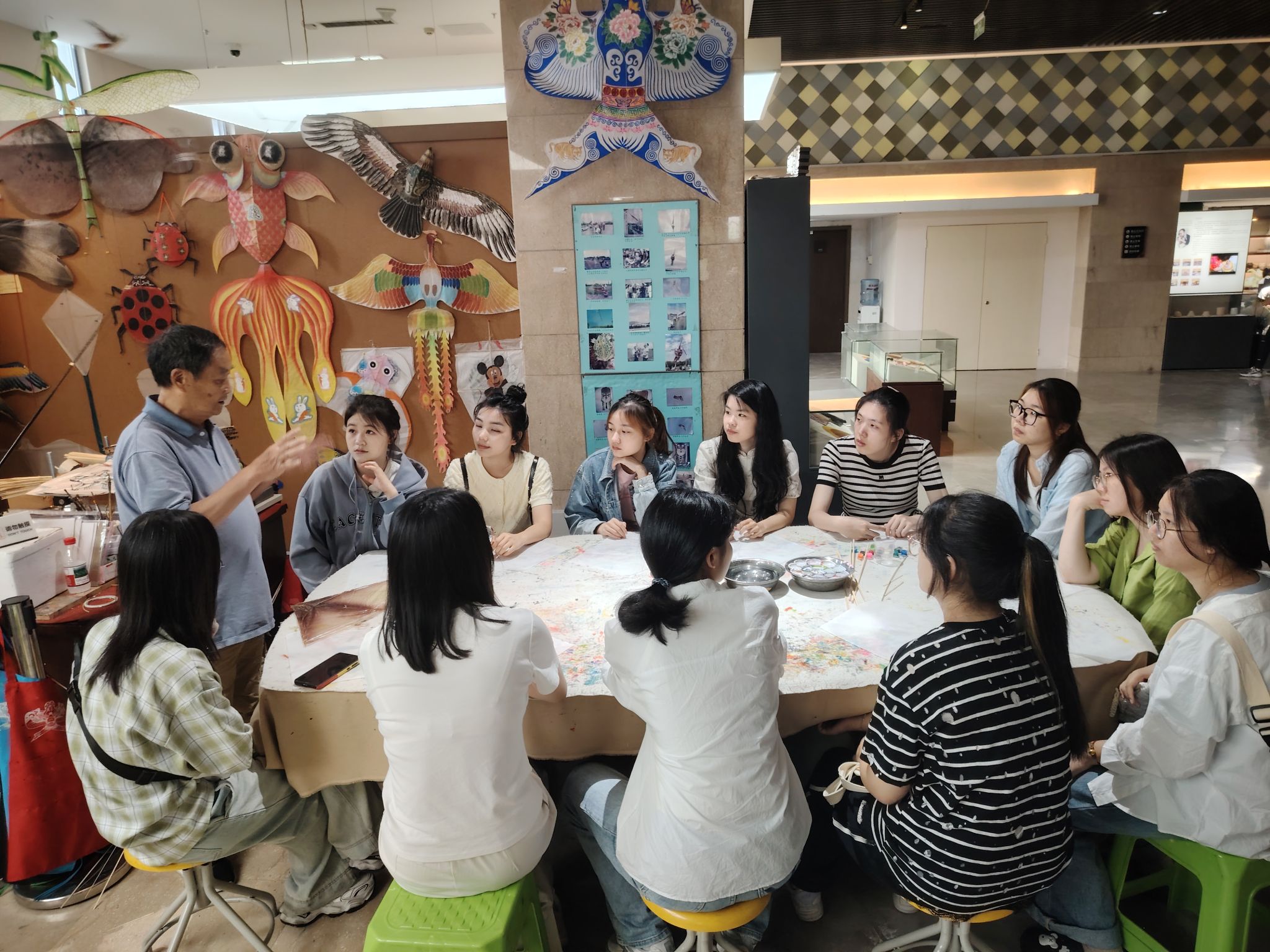当师生们走进杭州工艺博物馆,目光立即为馆内琳琅满目的大师工艺作品所吸引。根据分组,同学们兴高采烈地投入到拓印技术、风筝制作、伞面绘画等非遗体验项目,在指尖雕琢中感受匠心,在墨香之间体悟传承。“这不只是简单的手工体验,更是一次深度的文化浸润。”参与学生纷纷表示,非遗不再是抽象名词,而是真正“看得见、摸得着、能感知”的民族记忆与文化温度。
