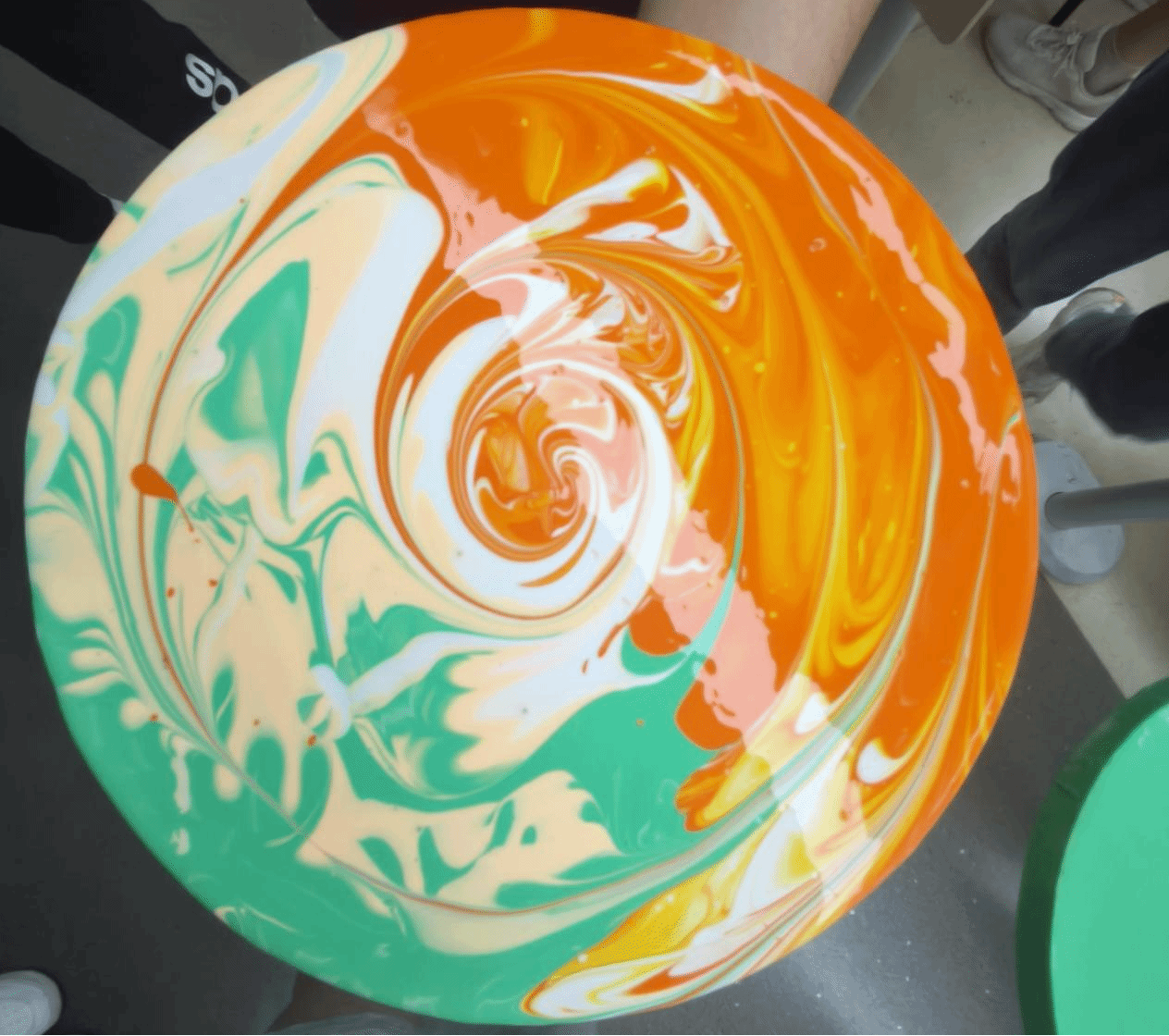“重智绘心·流体解压画”深度践行艺术疗愈理念。当丙烯颜料在画布上肆意奔涌,《凤凰》的创作者将橘红与翠绿泼洒成涅槃之翼,裂痕间的白色如希望之火跃动。心理教师现场解读:“色彩的非言语表达,是潜意识与焦虑的和解仪式”。参与者无需技法,仅凭直觉驱动肢体,在颜料流动中体验艺术疗愈的核心价值——让未被言说的压力通过视觉符号获得释放,在非评判场域中重建自我对话的通道。