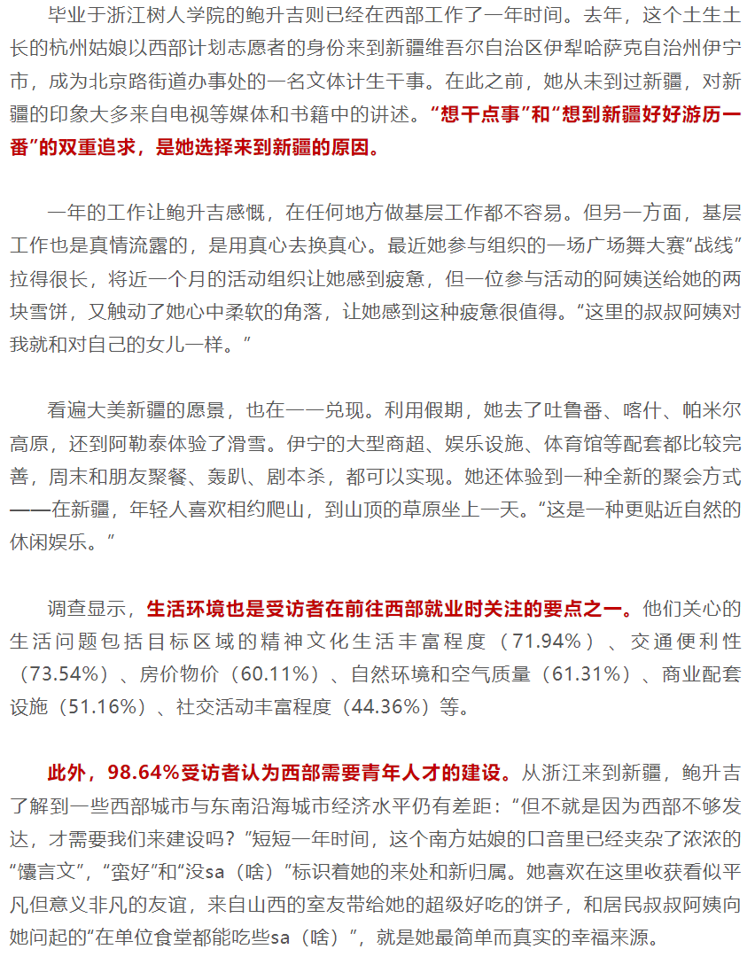从浙江来到新疆,鲍升吉了解到一些西部城市与东南沿海城市经济水平仍有差距:“但不就是因为西部不够发达,才需要我们来建设吗?”短短一年时间,这个南方姑娘的口音里已经夹杂了浓浓的“馕言文”,“蛮好”和“没sa(啥)”标识着她的来处和新归属。她喜欢在这里收获看似平凡,但意义非凡的友谊,来自山西的室友带给她的超级好吃的饼子,和居民叔叔阿姨向她问起的“在单位食堂都能吃些sa(啥)”,就是她最简单而真实的幸福来源。