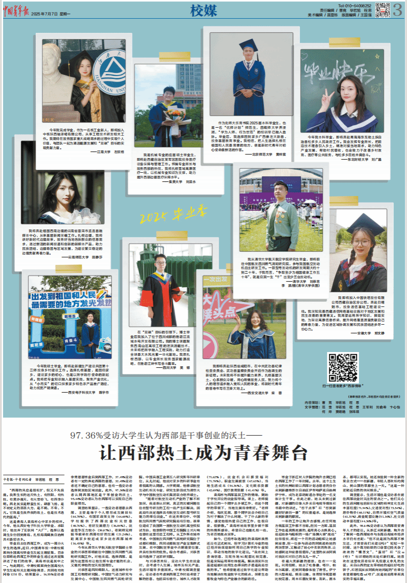 7月7日,在共青团中央公众号发布的文章《毕业去西部,因为需要,因为梦想》和《中国青年报》刊发的文章《97.36%受访大学生认为西部是干事创业的沃土——让西部热土成为青春舞台》中,永利官网西部计划志愿者会展经济与管理201班鲍升吉获报道关注。
