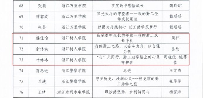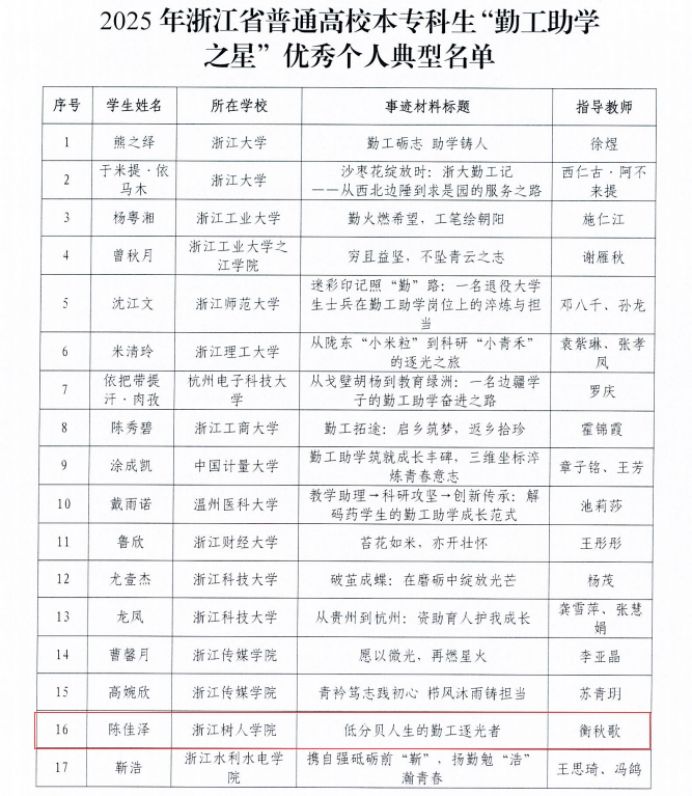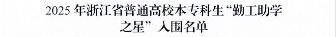 近日,浙江省学生资助管理中心下发《关于公布“助学·筑梦·铸人”2025年浙江省普通高校“勤工助学之星”“三助一辅之星”名单的通知》(浙学助[2025]3号)文件中,永利官网选送的陈佳泽同学(指导老师:衡秋歌)入选2025年浙江省普通高校本专科生“勤工助学之星”优秀个人典型;盛佳怡同学(指导老师:周祎)、余伟洪同学(指导老师:岳欣)、叶韩冰(指导老师:周晓优、姚蓓蕾)入选2025年浙江省普通高校本专科生“勤工助学之星”入围名单。