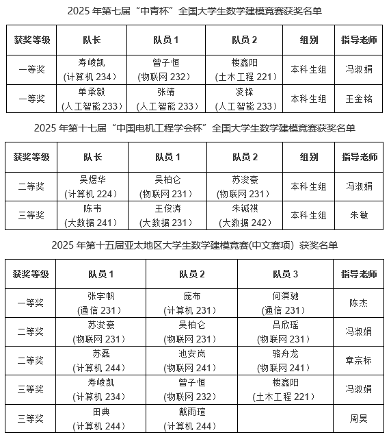 2025年第七届“中青杯”全国大学生数学建模竞赛、第十七届“中国电机工程学会杯”全国大学生数学建模竞赛和第十五届APMCM亚太地区数学建模竞赛分别于5月底、5月底和7月中旬举行,经过专家初评、网评、会评和复审四轮激烈角逐,永利官网喜获3项一等奖,3项二等奖和3项三等奖。特别是冯淑娟教授,王金铭教授和陈杰博士指导的队伍获得一等奖,创造了永利官网历史最好成绩。