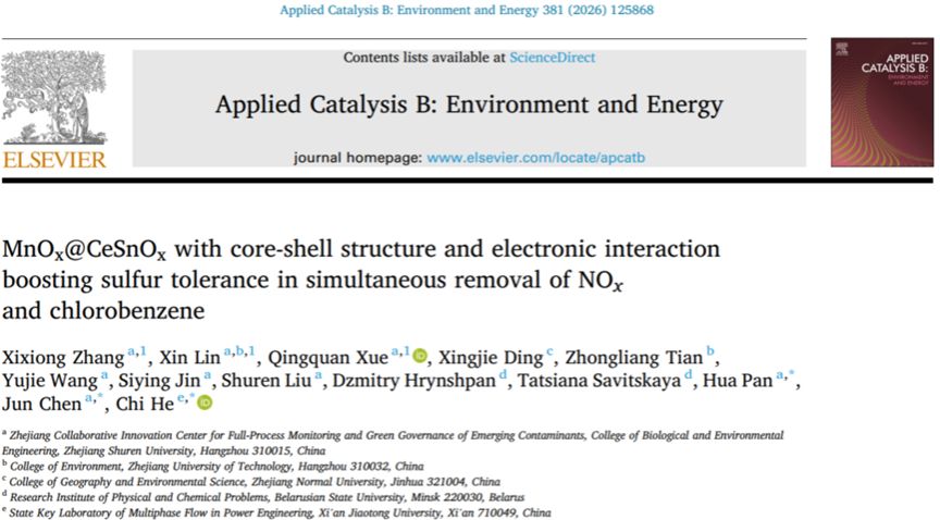 近日,永利官网生物与环境工程学院(含交叉科学研究院)环境功能材料及污染控制团队在国际顶刊《Applied Catalysis B: Environment and Energy》(影响因子IF = 21.1,中科院1区,TOP)上发表了题为“MnOx@CeSnOx with core-shell structure and electronic interaction boosting sulfur tolerance in simultaneous removal of NOx and chlorobenzene” (https://doi.org/10.1016/j.apcatb.2025.125868)的研究论文。团队负责人潘华教授为通讯作者,团队成员张细雄博士为第一作者,联培研究生凌鑫、团队成员薛清泉副教授为共同一作,永利官网陈浚教授及合作单位西安交通大学何炽教授为共同通讯作者。永利官网为论文的第一署名单位和通讯单位,西安交通大学为共同通讯单位。这是该团队今年在该期刊上发表的第2篇研究论文,标志着永利官网在环境催化领域的研究取得了一系列重要进展。