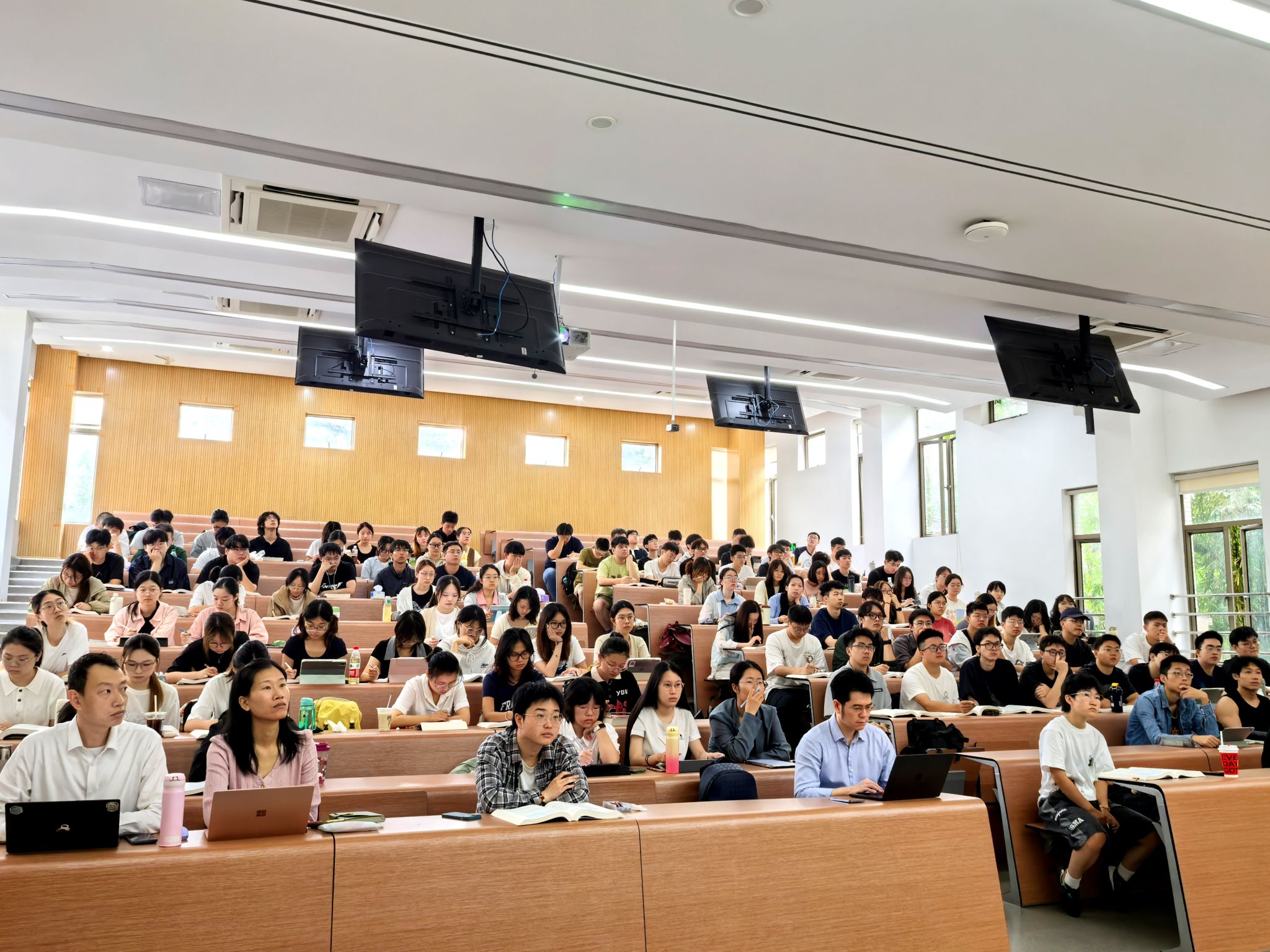 在课上,郑院士结合自己五十多年的从医经验,通过鲜活的临床案例,向学生们讲解了外科学的核心:不仅需要精湛的技术,更需要尊重生命、守护生命的责任感。郑院士详细介绍了肝脏解剖结构和当前肝脏外科学的发展,并结合实际患者的案例生动地讲述了各种肝脏疾病的知识,将枯燥的知识具象化。同学们在课堂上认真听讲,仔细记录。一位同学在课后表示:“郑院士让我认识到,真正的榜样应该是像他这样,在手术台上挽救生命、用专业和爱心服务人民的科学家。这让我明确了未来要努力的方向。”
