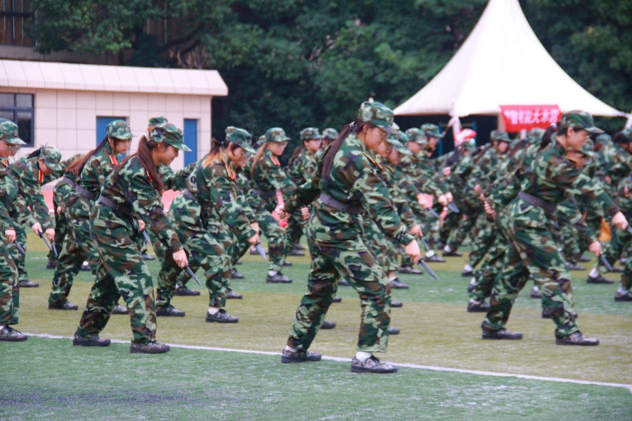 另一边,在匕首操训练中,同学们手持模拟匕首,动作迅猛有力,一招一式刚劲利落,充分展现了女生的飒爽英姿与男生的阳刚之气;军体拳方阵的同学们动作刚劲有力,步伐稳健,气势如虹,一招一式尽显青春风采。