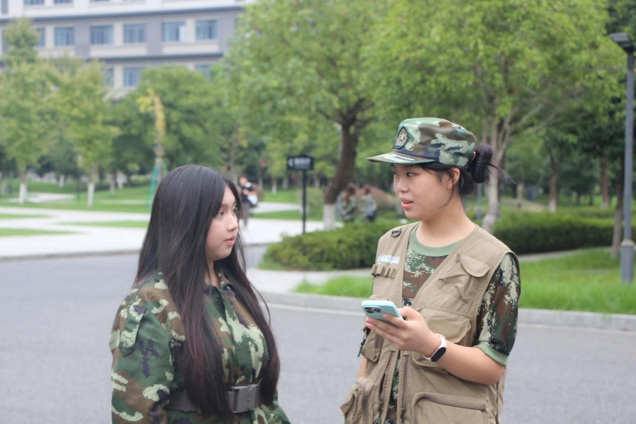 在迷彩服的海洋中,有一群人格外特殊。他们身着印有校全媒体中心标志的马甲,穿梭于各营连之间。他们是通讯兵——这场军训的记录者和发声者、不可或缺的“幕后力量”。