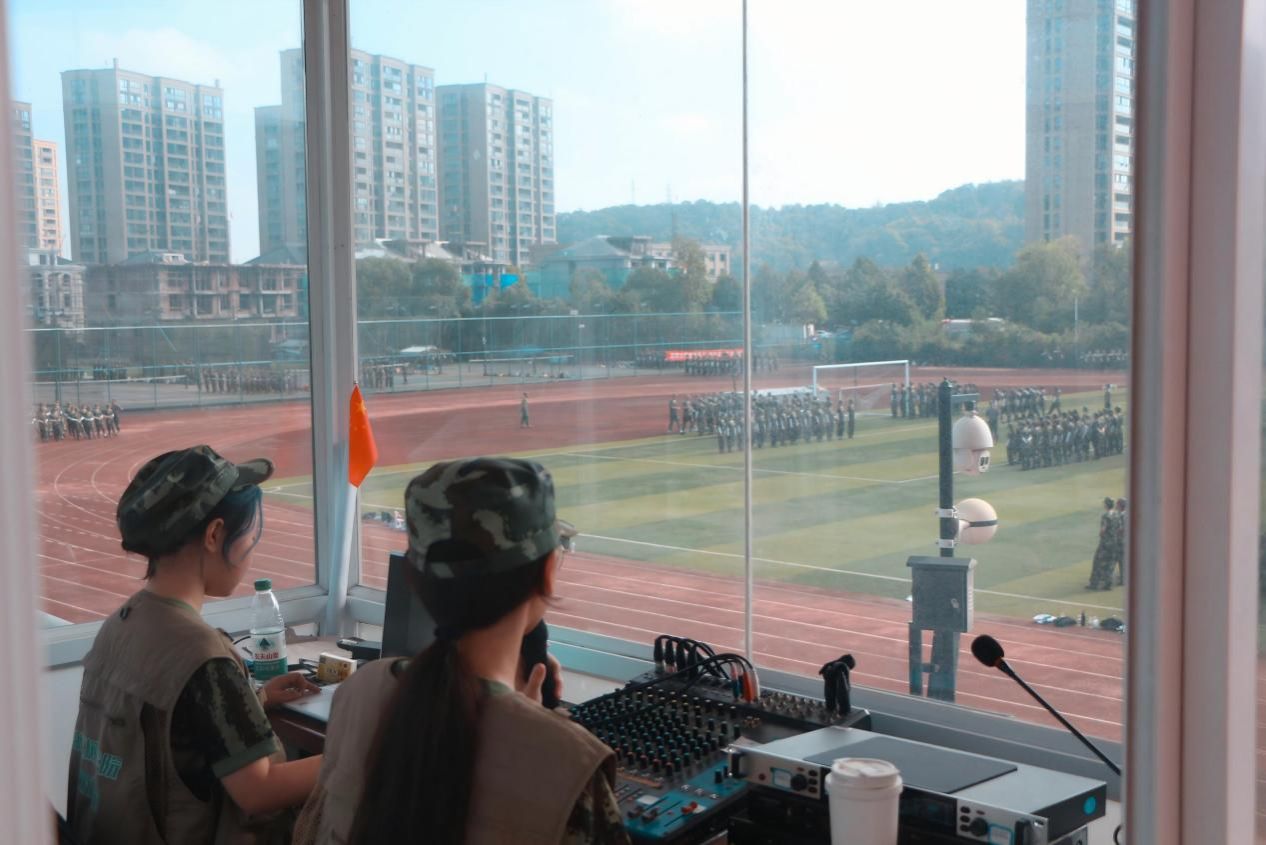 播音间里,主播贾欣怡的声音铿锵有力:“青春无畏烈日,磨炼成就非凡,坚持住!”而在她身后的导播台前,吴若萱正全神贯注地注视着设备屏幕——设备状态、稿件流程、训练进度在她脑中构建成一体网络。与场上训练的战友和台上播音的队友不同,她的视角更像一个“总调度”,需要同时关注训练进度、设备状态和稿件流程,让所有环节无缝衔接。“这种感觉不是掌控,而是一份沉甸甸的责任,”吴若萱说这话时,目光仍没有离开闪烁的指示灯。