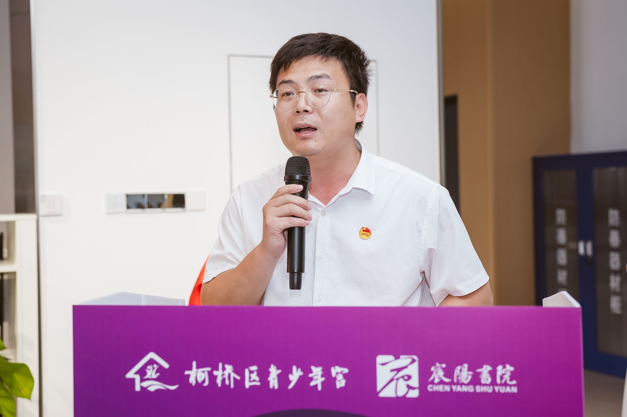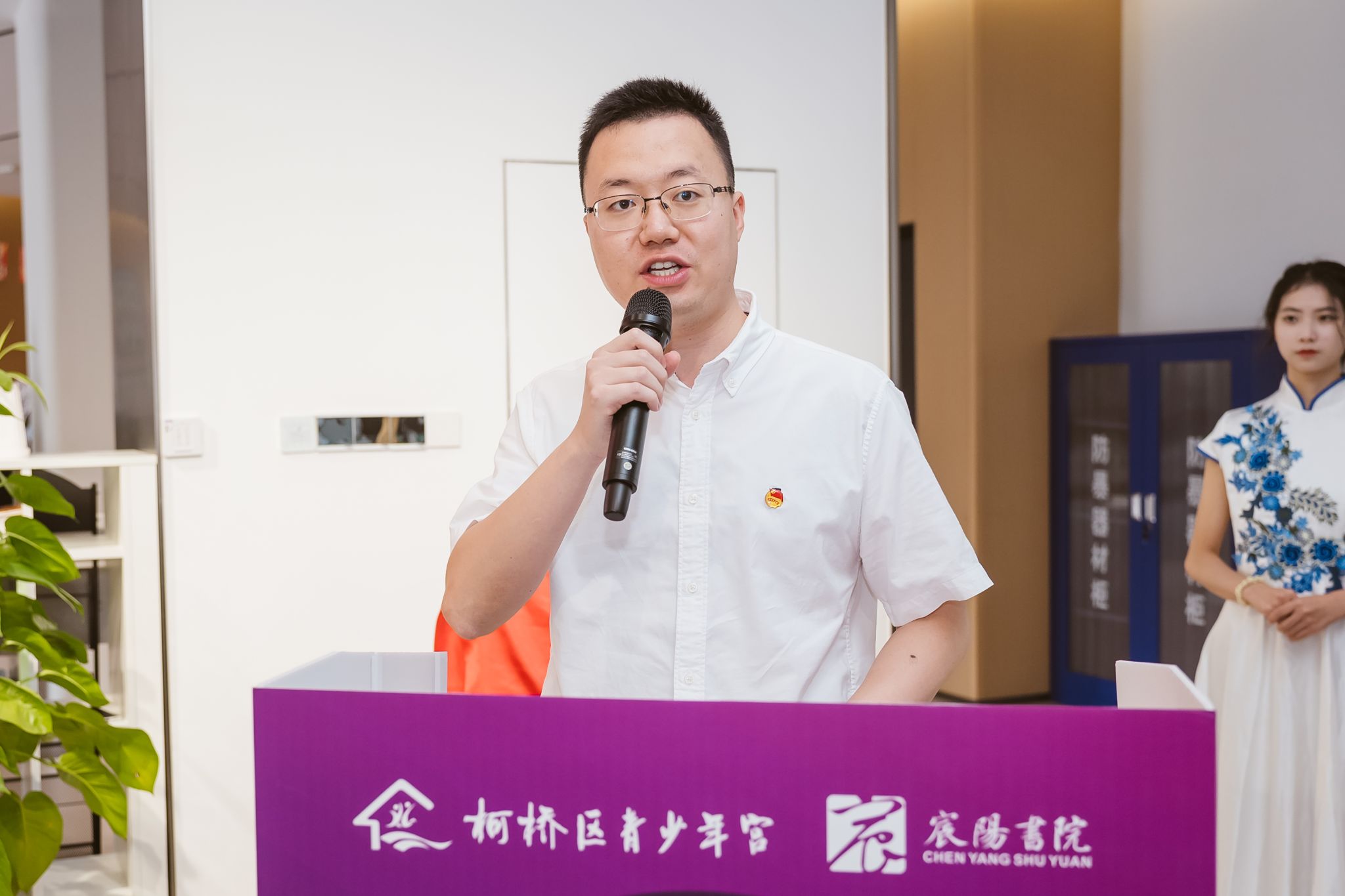 仪式在宸阳书院直属党支部书记王璀的主持下拉开帷幕。丁赞华首先致辞,他代表304永利集团官网团委对各位嘉宾的到来表示热烈欢迎,对柯桥区青少年宫长期以来对学校育人工作的支持表示衷心感谢。丁赞华指出,本次合作是在双方共建“青少年成长实践基地”基础上的进一步深化,是宸阳书院推动大中小学资源共享、优势互补、协同育人的关键举措。他强调,非遗是民族文化的精华与智慧结晶,推动非遗融入国民教育体系,对增强文化自信、促进青少年全面发展具有重要意义。