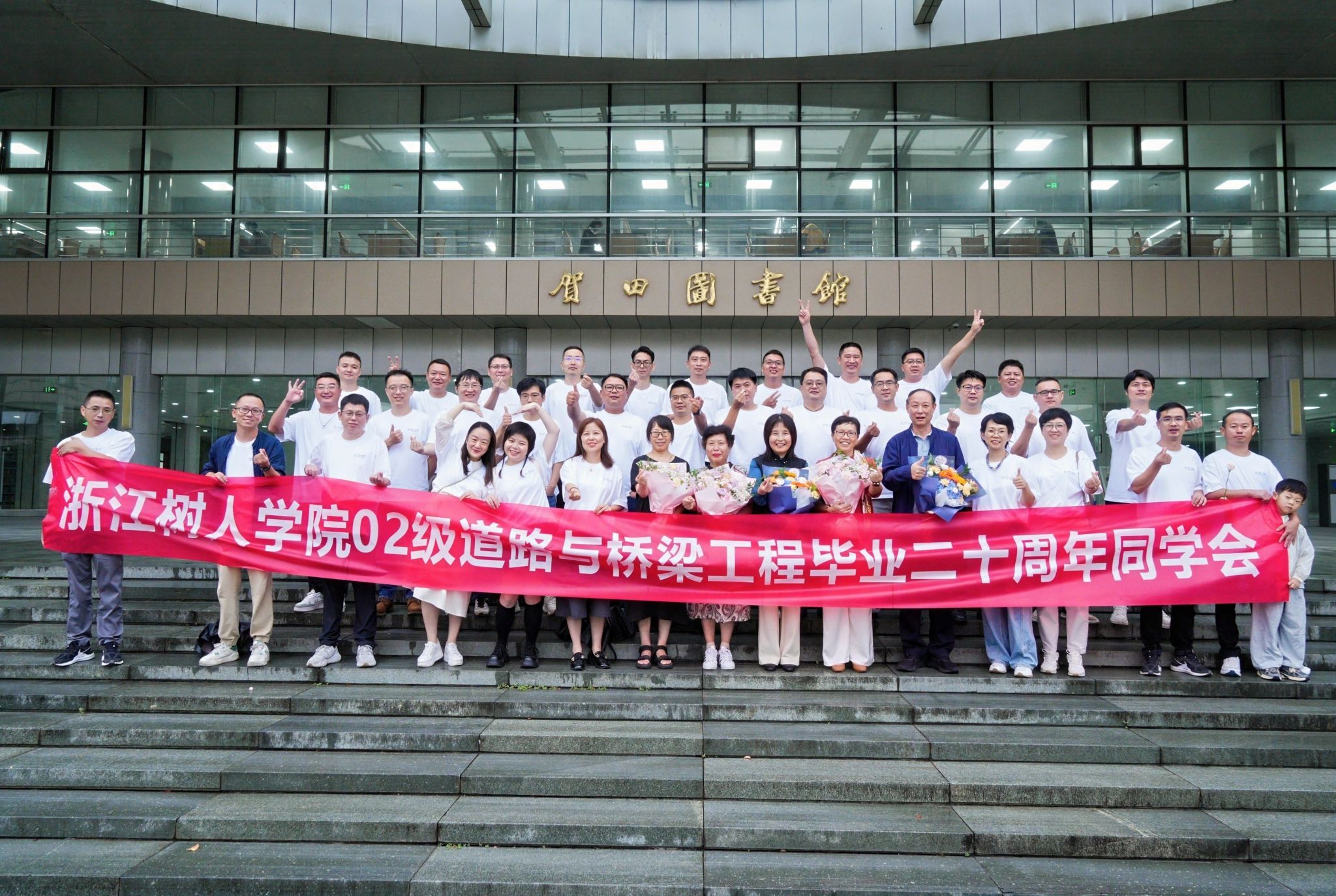 2025年10月18日,2002级道路与桥梁工程专业校友从全国各地重返母校,在拱宸桥校区隆重举行毕业二十周年同学会。30余位校友与昔日恩师同窗欢聚一堂,重温校园记忆。出席本次活动的有学校教育部高校思创中心执行主任、原学院副书记宋斌,城建学院院长、2002级道桥专业班主任金小群,城建学院党委书记苏根良,以及曾任教该班的专业课教师与辅导员徐根洪、徐毅青、王艳、吴章土等。