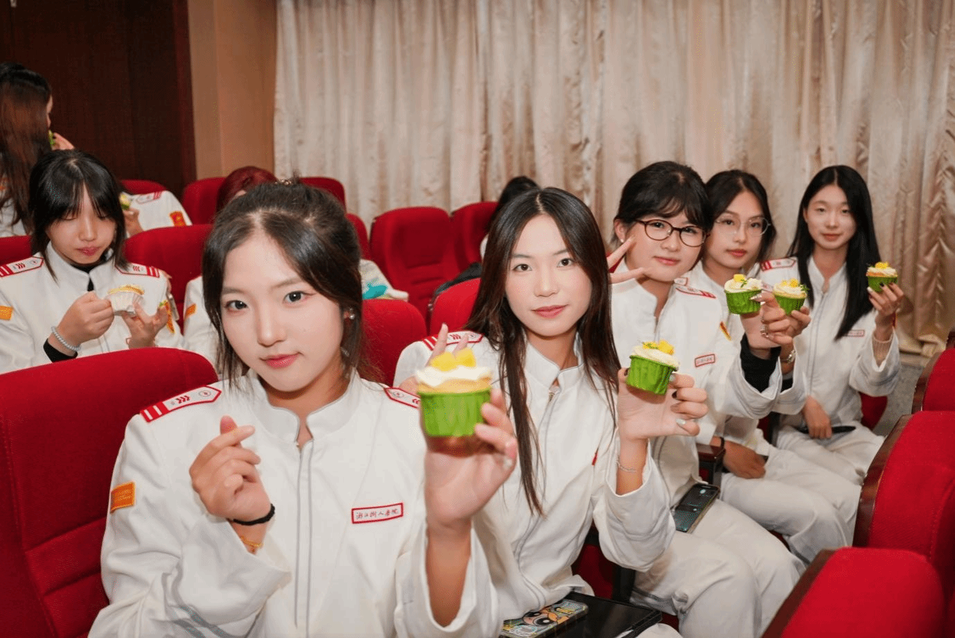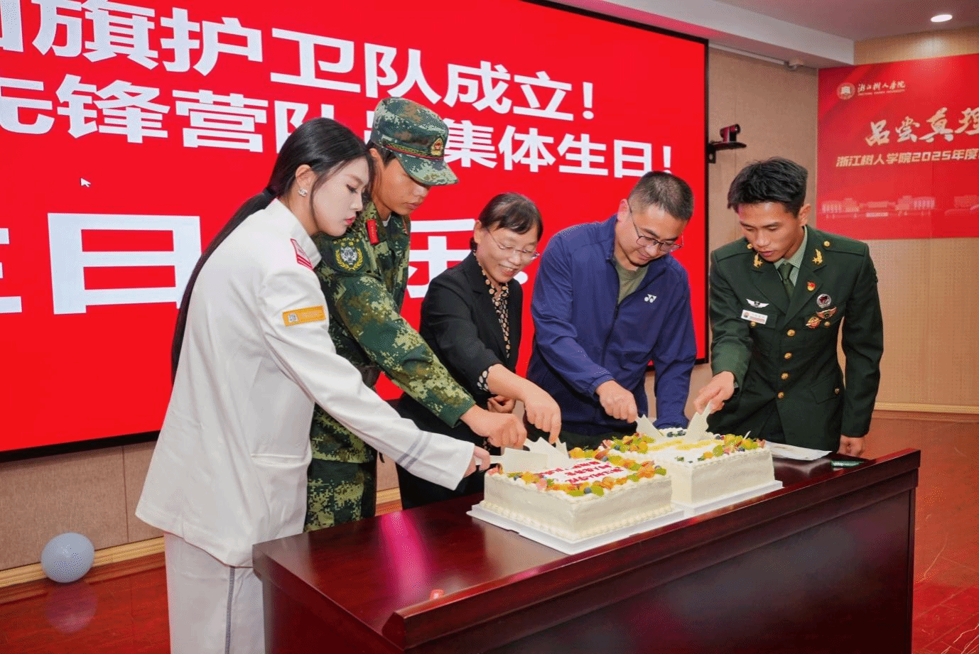 全体师生合影后,现场还为国旗护卫队庆生、为先锋营队员过集体生日,师生代表共切蛋糕,气氛温馨热烈。