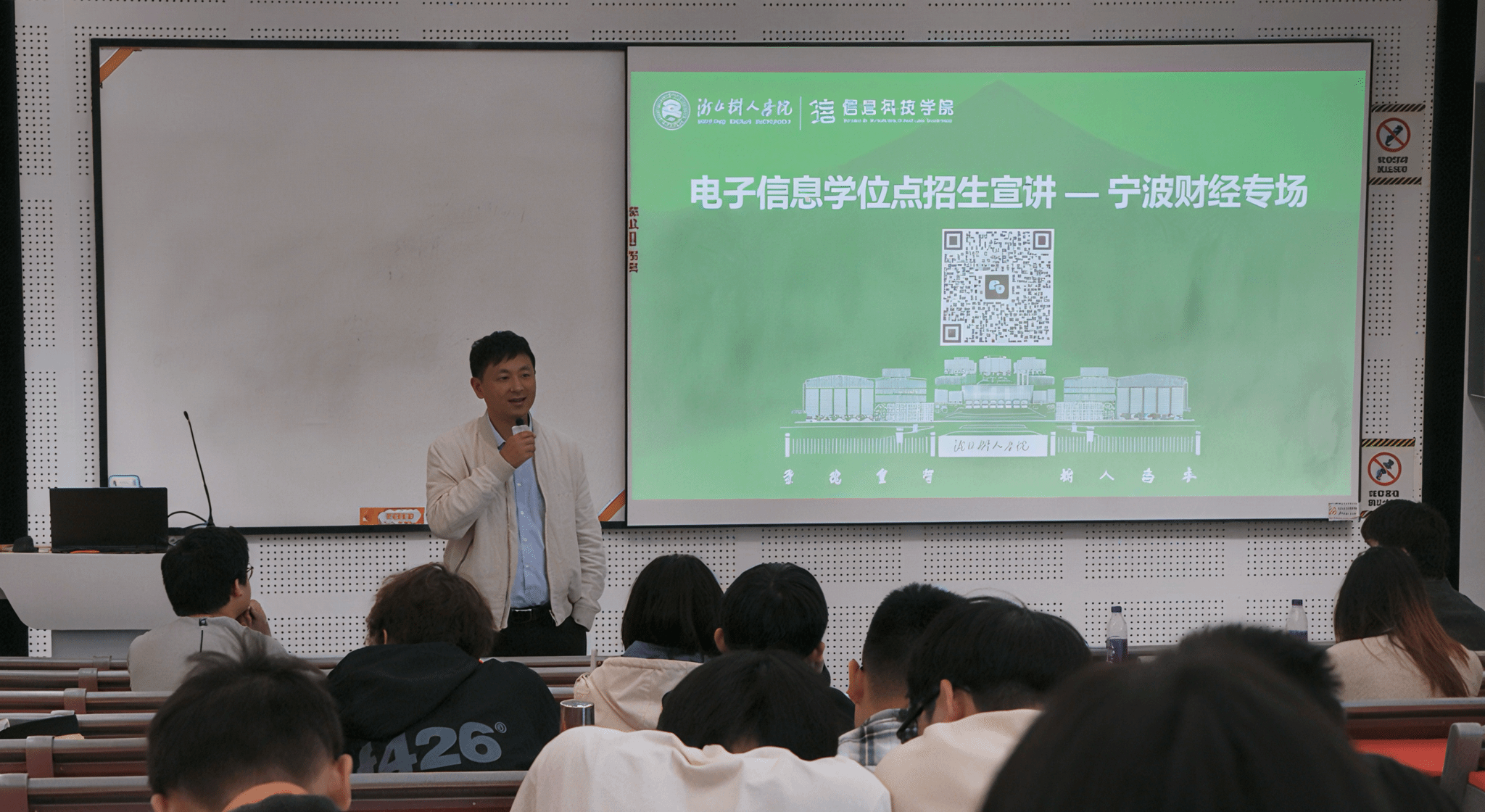 宣讲会伊始,戴国勇代表信息科技学院对宁波财经学院数字技术与工程学院的统筹协调表示感谢,并围绕 “学校优势 — 学院特色 — 学位点实力” 三维度展开主讲。在学校层面,他详细介绍了学校的办学定位、学科布局、科研平台及人才培养体系,重点提及学校在信息领域的学科优势与产学研融合成果,让学生直观感受学校的学术氛围与发展潜力;学院层面,他从师资力量、科研团队、教学资源等方面切入,结合学院近年来在技术攻关、学科竞赛中的亮眼成绩,展现信息科技学院的育人实力与学科特色;电子信息学位点介绍环节,戴国勇聚焦学位点的培养目标、三个招生方向以及实践基地,阐述了学位点在培养 工程技术创新人才方面的优势,为学生勾勒清晰的学业发展路径。