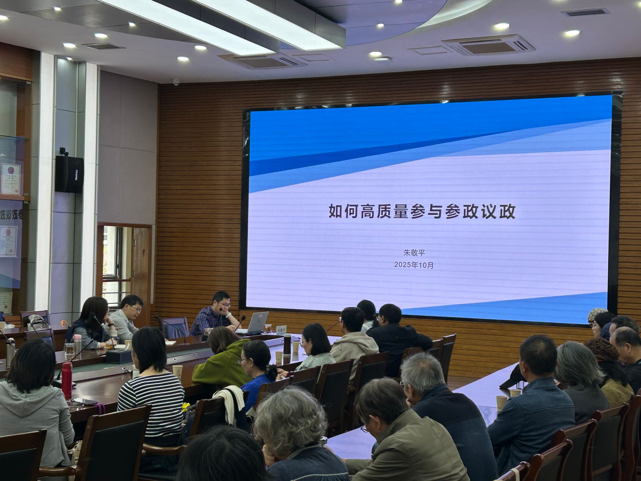 随后,会员们前往浙江农林大学,联合开展支部联谊活动并举办主题讲座。民进省委会调研部副部长朱敬平以《参政议政能力提升培训》为题作专题授课,结合自身多年申报实践经验,通过典型案例剖析申报要点,为会员提升参政议政能力提供了实用指导。