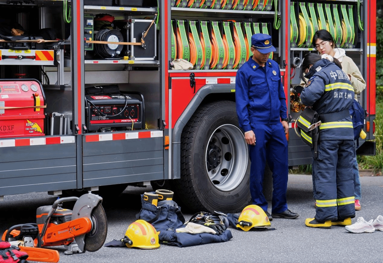 互动体验区作为本次活动的亮点,特邀两校区消防站工作人员进校展示各类消防器械,并组织师生参与消防服穿脱体验。此外,模拟真实火场环境的“逃生屋体验”和“灭火器实操”等项目,也让同学们在实战演练中进一步提升应急处理能力。