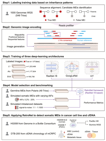 RetroNet的核心创新在于将测序读段及其比对特征转化为二维图像,在保留关键信息的同时弱化噪声,使深度学习模型能够直接从视觉信号中识别移动元件插入特征。该方法在癌症细胞系中实现了0.885的高精准度和0.579的召回率,检测到的移动元件插入频率低至1.79%。RetroNet对循环肿瘤DNA等降解样本也保持稳定性能,为液体活检和癌症早筛提供了新的可能。