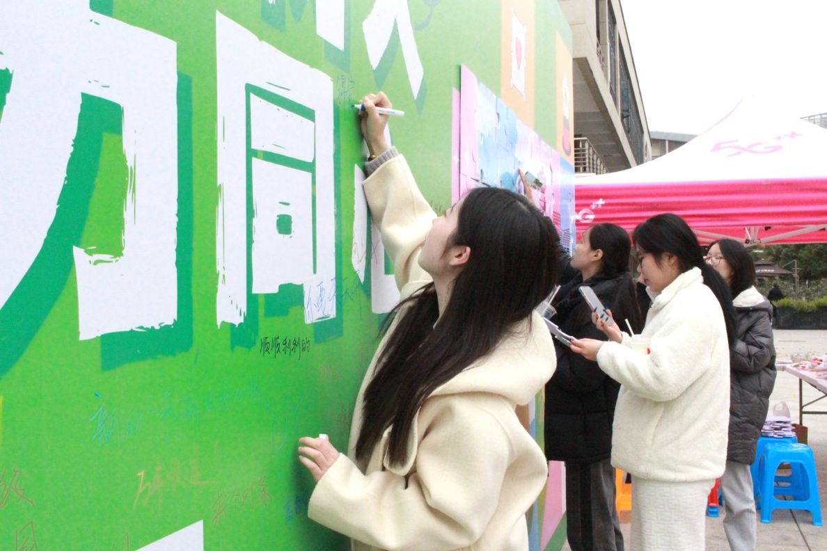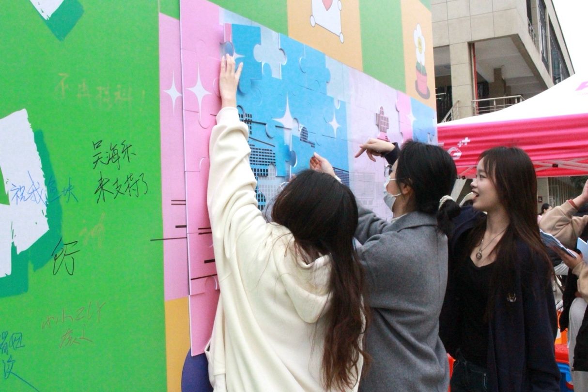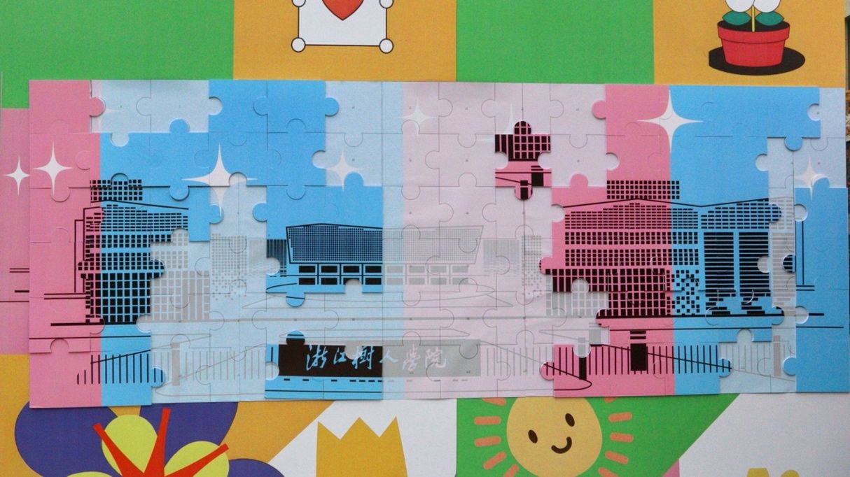 如果说问答环节是“脑力比拼”,那么“校区拼图·寄语留痕”环节则是“情感共鸣”的舞台。活动现场摆放的大型拼图,以杨汛桥校区实景为原型,将贺田图书馆、查济民大厦等标志性建筑融入其中,参与活动的成员需合作完成拼图,再在留言墙上写下对学校的祝福或是对未来的期待。
