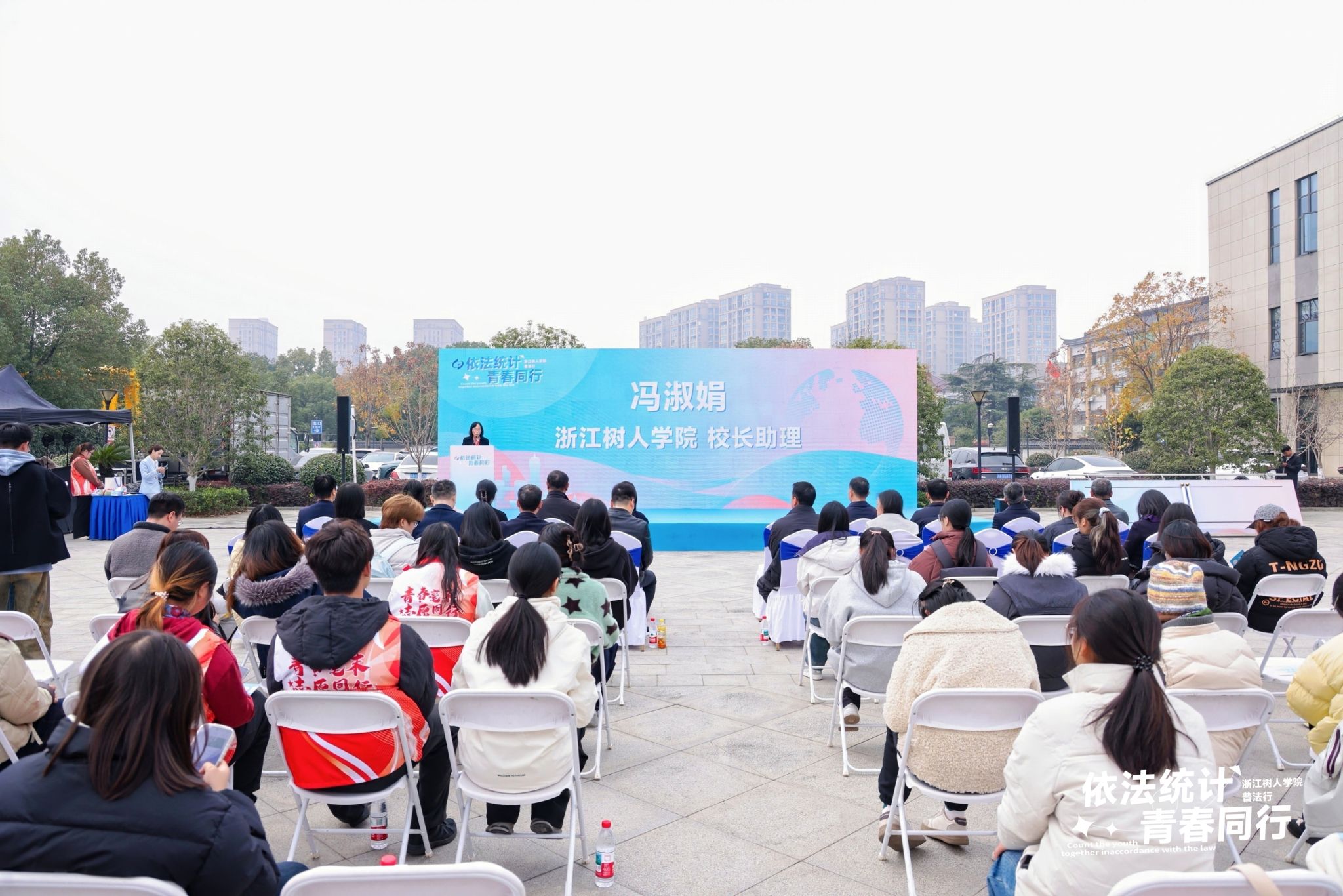首先,由校长助理冯淑娟教授代表学校致辞。她指出,统计关乎国家治理与科学决策,统计法与师生学习科研生活紧密相连。此次普法进高校活动,是落实全面依法治国战略、提升师生数据素养的关键举措。学校始终重视法制教育,构建了立体化体系,在近期浙江省学生学宪法讲宪法活动中,学生团队和个人斩获佳绩,彰显了扎实成效。她对同学们提出三点希望:一要厚植法治理念,主动学习法律知识,让法治精神内化为准则;二要锤炼数据思维,将统计法要求转化为专业能力,积累过硬本领;三要争做普法先锋,向身边人普及统计法,营造良好校园法治氛围。最后,她预祝本次活动圆满成功,感谢各方支持,将法治精神融入校园,助力培养新时代法治人才。