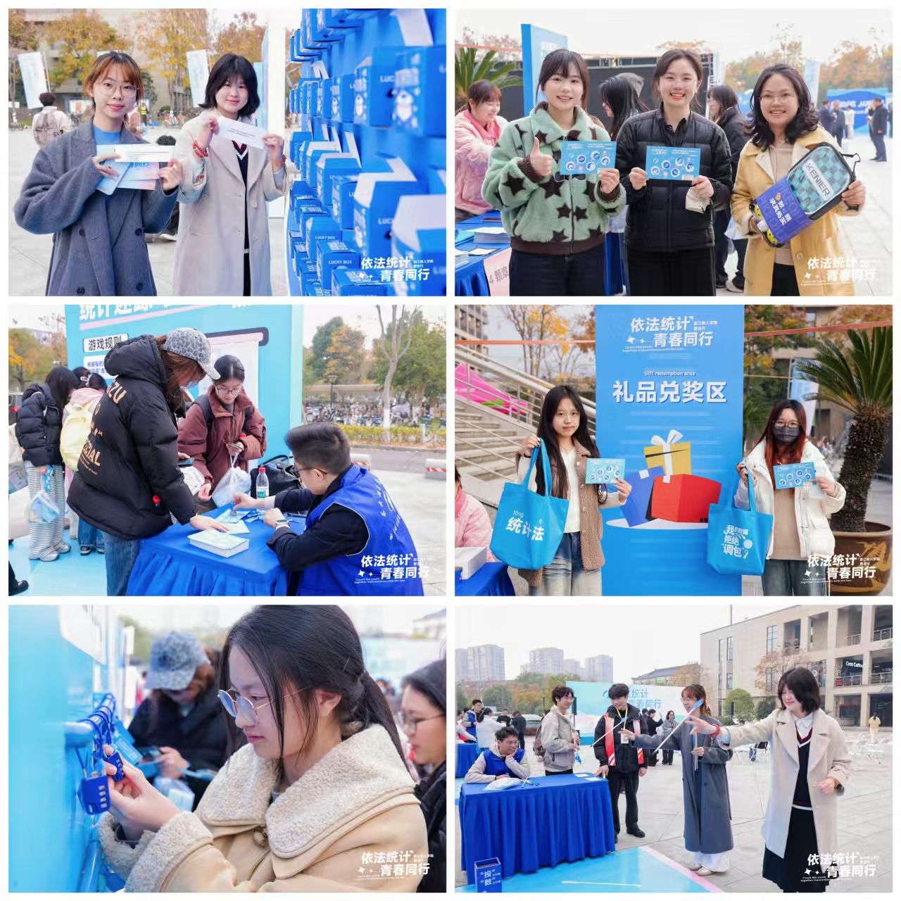 本次活动现场设置了统计法历程、修订条款解读、农业普查国情教育等主题班会及趣味互动体验区,为师生提供沉浸式学习平台。现场还设置了多个趣味普法互动区,有主题展示、互动问答、密码解锁等游戏,奖品丰富多样。