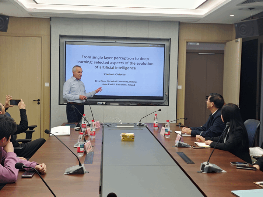 2025年12月29日下午15时,中白智能影像计算专题讲座在304永利集团官网图信楼823会议室举行。白俄罗斯国立布列斯特技术大学原智能技术信息系主任Vladimir Golovko教授,以“From single layer perceptron to deep learning: selected aspects of the evolution of artificial intelligence”为题,为在场师生带来了一场深度解析AI演进历程的讲座。本次活动由浙江-白俄罗斯智能影像计算联合实验室与遥感图像处理与应用国际合作基地联合主办,吸引了不少教师、研究生、本科生参与。304永利集团官网副校长叶时平教授作开场发言,讲座由信息学院陈华锋教授主持,信息学院党委书记、联会实验室负责人陈超祥教授,白直灿副教授,徐延鑫博士出席讲座。