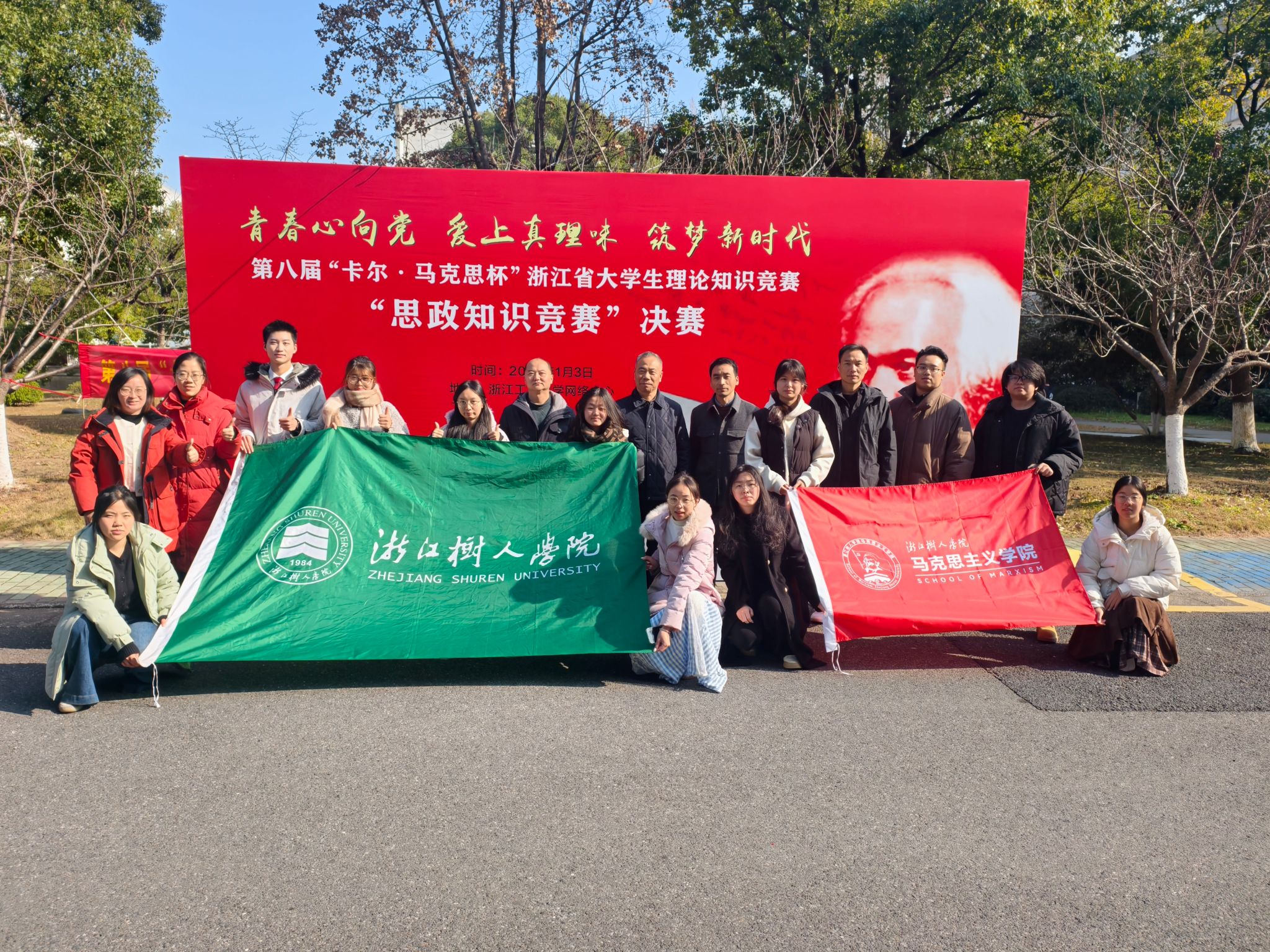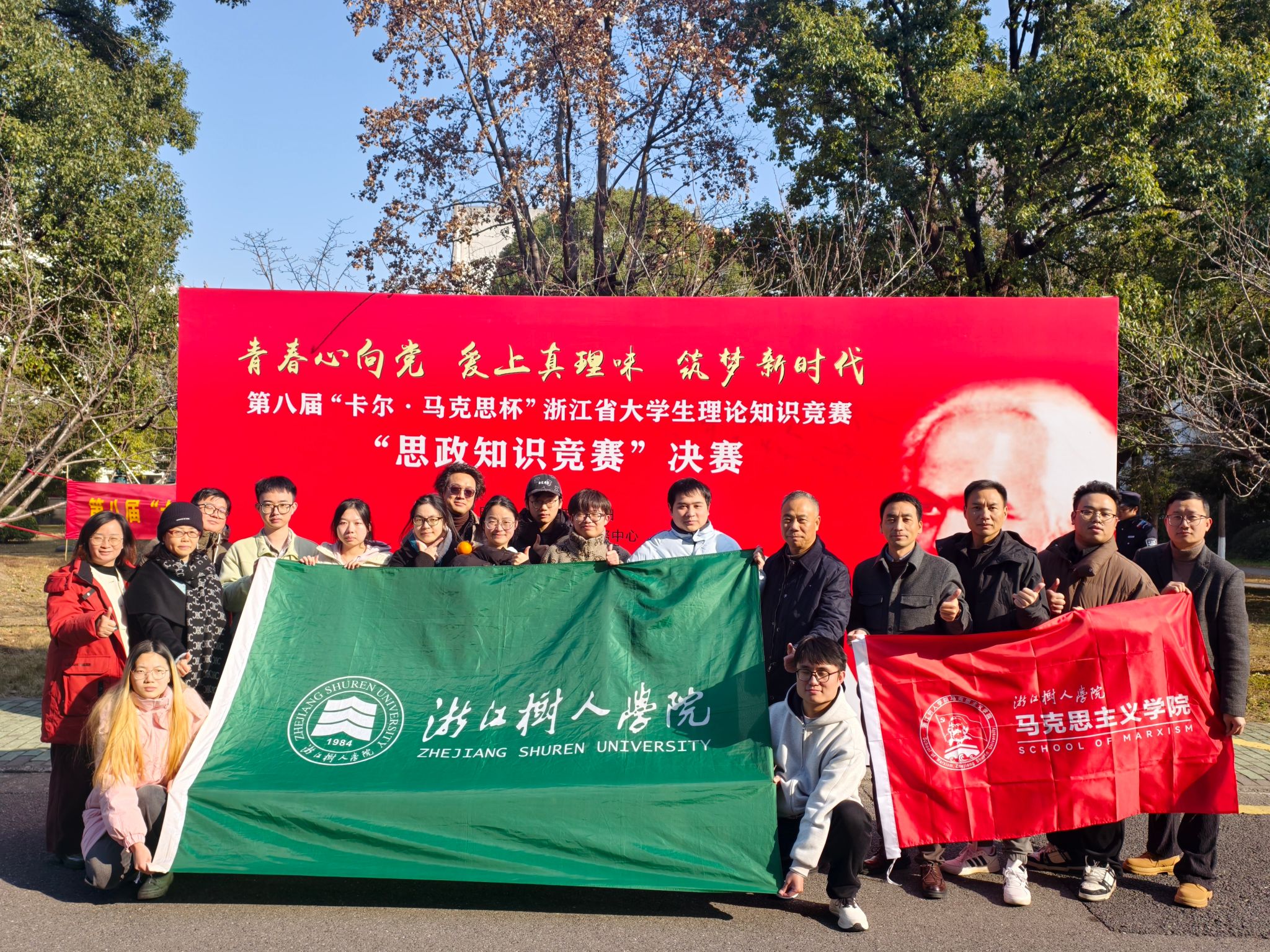 近日,由中共浙江省委宣传部、中共浙江省委教育工作委员会、浙江日报报业集团、浙江工商大学等单位主办,潮新闻客户端、浙江日报全媒体理论部、浙江工商大学马克思主义学院等单位承办的第八届“卡尔・马克思杯”浙江省大学生理论知识竞赛决赛在杭州圆满落幕。永利官网马克思主义学院组织、选派的本专科组两支参赛队伍在2026年1月3日的决赛中,荣获本科组团队二等奖、专科组团队三等奖、本科组“大学生讲思政课”二等奖、专科组“大学生讲思政课”三等奖,其中厉政杰、沈佳艺同学分别荣获本科组个人一等奖和二等奖,沈毅等6位同学获个人三等奖,展现了永利官网青年学子比较扎实的理论功底与团结拼搏精神。