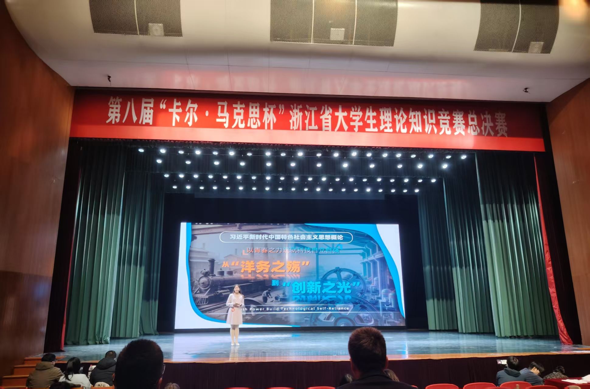 决赛阶段设置“思政知识竞赛”与“大学生讲思政课”两大环节:前者通过理论知识竞赛的方式考查理论功底,后者要求选手以 6 分钟微课形式展现理论应用能力,试题涵盖习近平新时代中国特色社会主义思想、党史党建、浙江实践等核心内容。赛场上,永利官网队员牢记嘱托,沉着应战。在“讲思政课” 环节中,本科组代表郑昕同学以“从‘洋务之殇’到‘创新之光’”为题,生动诠释了马克思主义理论在我国新时代科技创新领域的实践价值,赢得了评委们的认可。