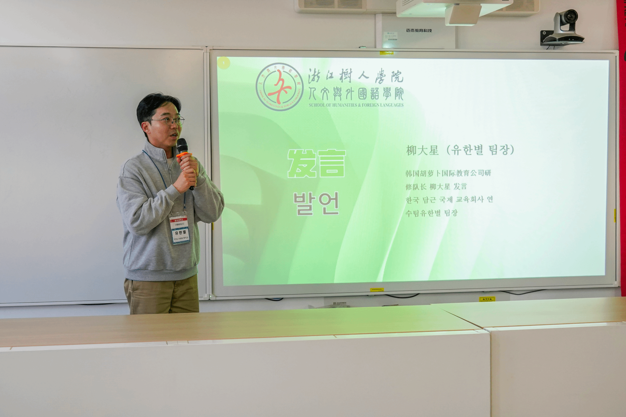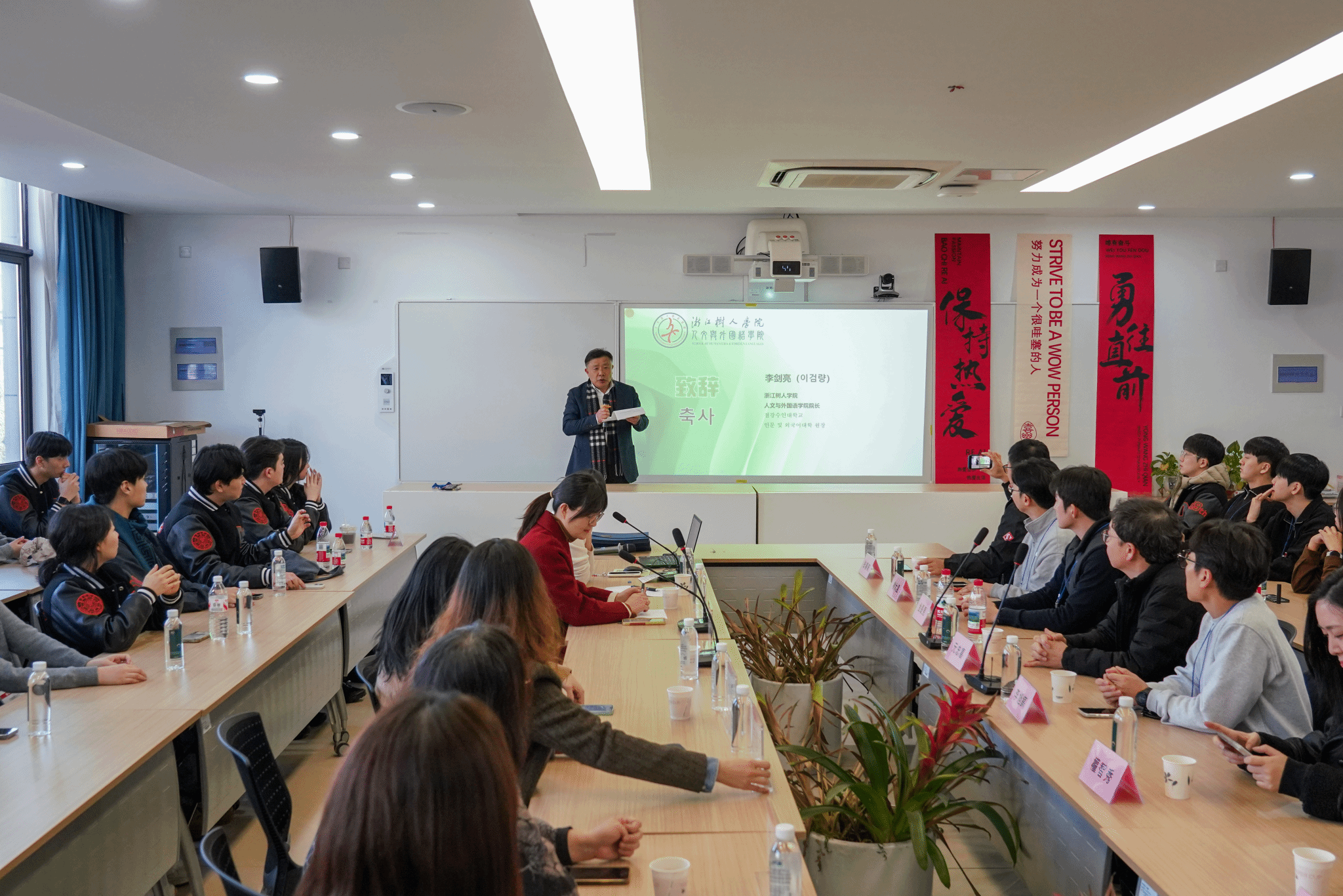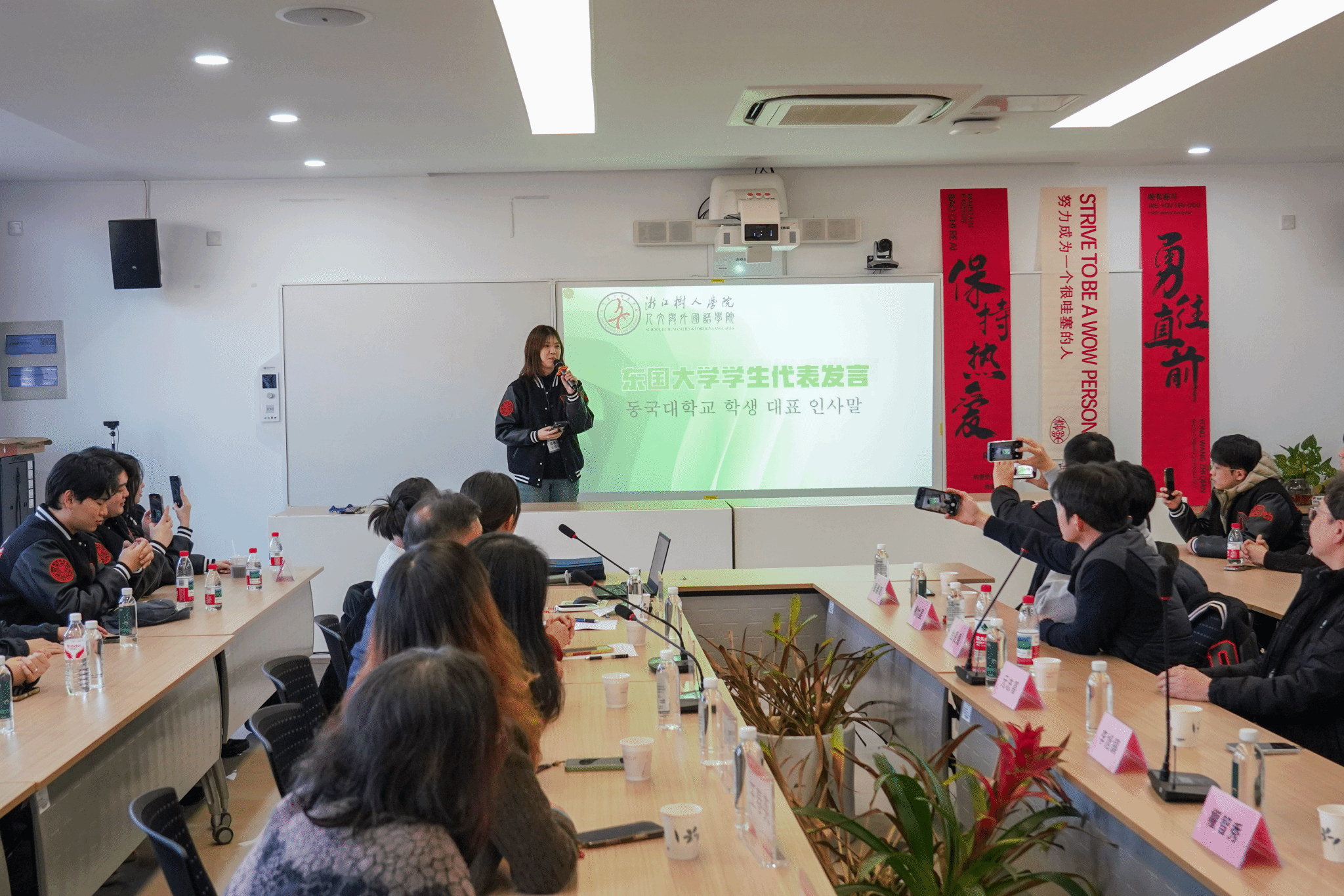 李剑亮院长在致辞中分享了个人与韩国的深厚渊源,引发了在场嘉宾的广泛共鸣。随后,双方师生代表畅所欲言。韩方教师与学生一致表示,此次杭州与树人学院之行收获远超预期,不仅深化了对中国的认知,更燃起了持续探索与合作的强烈意愿,回国后将积极推动更多交流项目。永利官网朝鲜语专业的学生代表则分享了与韩国友人相处的心得,表示通过此次高规格的接待与翻译实践,专业技能与跨文化沟通能力得到了极大锻炼,未来将继续担当好中韩友好使者的角色。