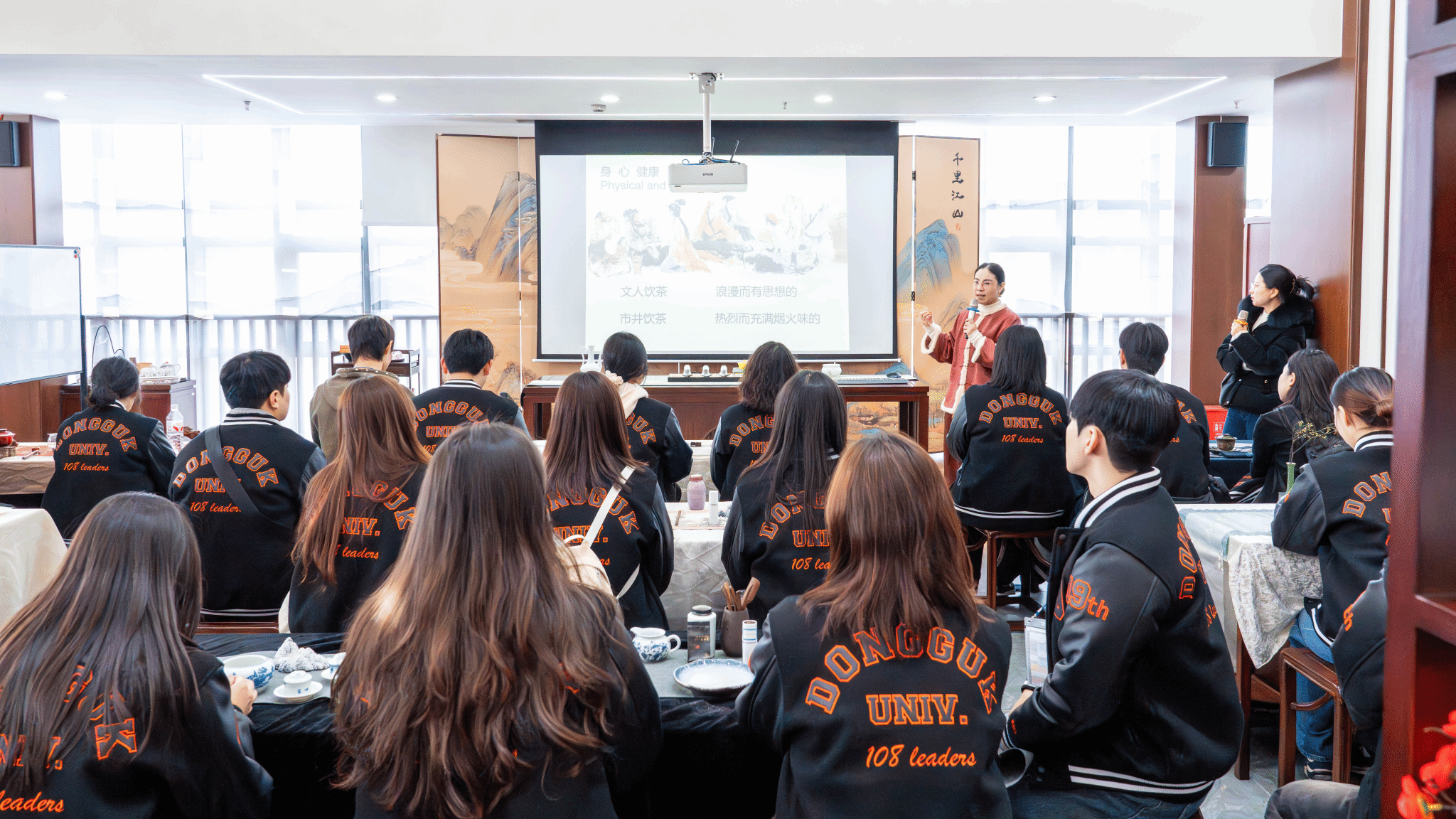 随后,代表团沉浸于一场由中国国际茶文化专业带来的美学盛宴。袁微老师以专业且热情的导览,系统梳理了中国自唐宋至明清绚烂多彩的茶文化史。