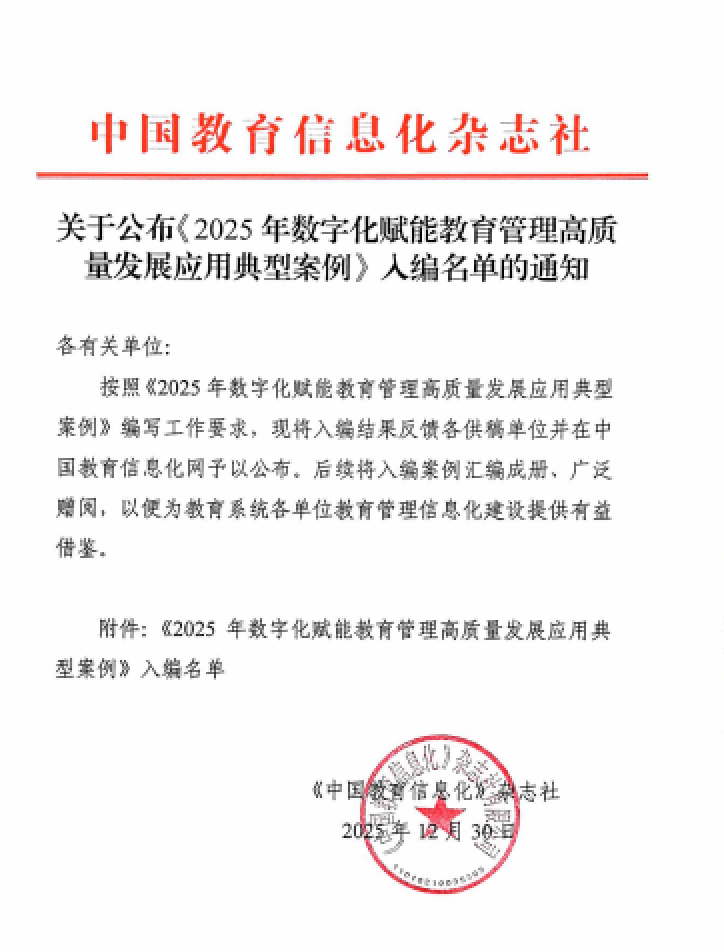 本次案例评选活动旨在系统梳理并推广教育数字化转型中的先进经验与典型模式,涵盖省市县及各级各类学校。经多轮评审,永利官网从全国500余个案例中成功跻身最终130个典型案例(其中高校教育管理高质量发展应用典型案例42个),将在《中国教育信息化》杂志、中国教育信息化网专题刊发,面向全国推广。