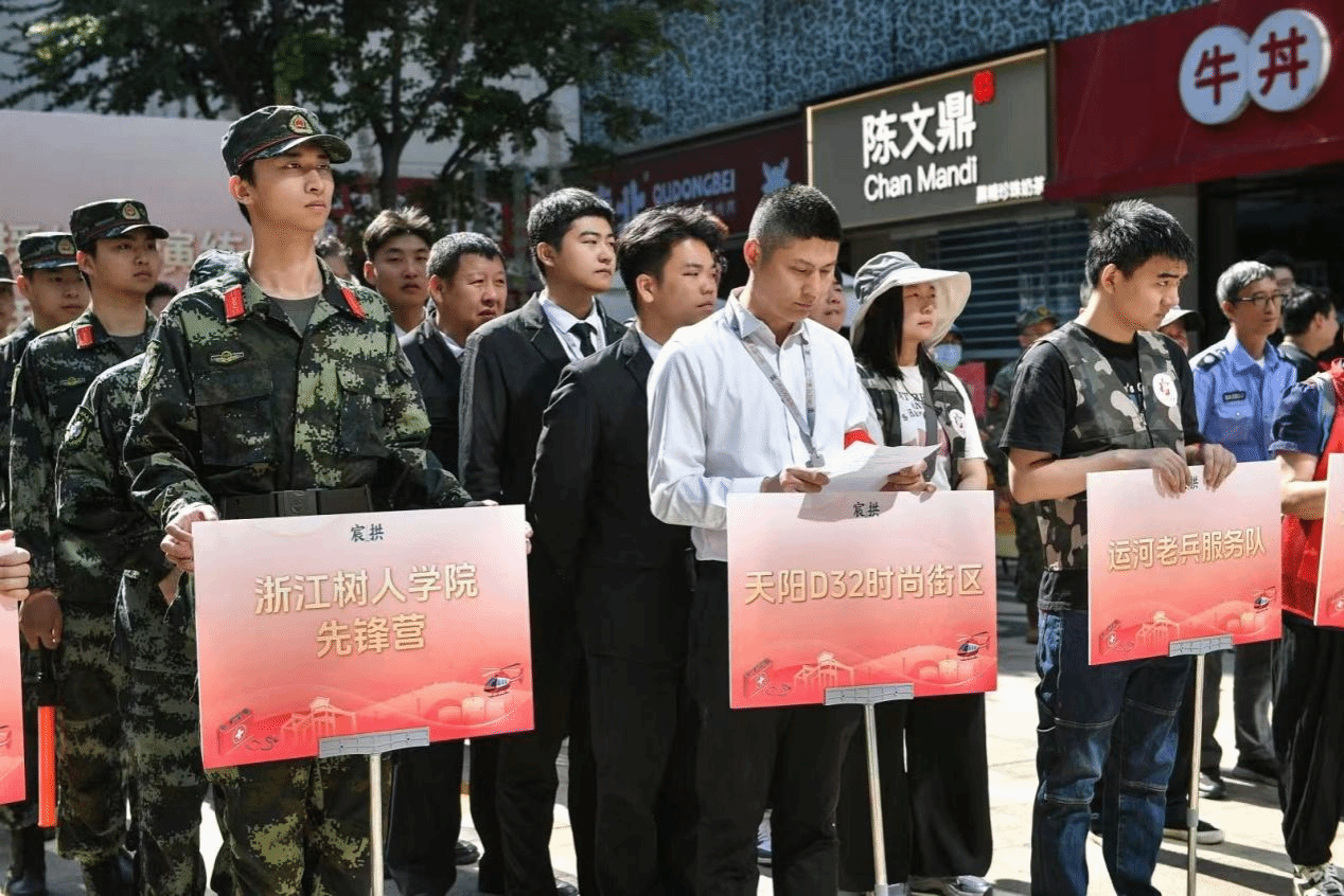 由学校退役军人及爱国拥军学生组成的“树人先锋营”,在安保部(人武部)的统筹下,承担起校园军训、护旗升旗、治安巡逻、征兵宣传及社会服务等任务,是校园学生社团队伍中一抹亮丽的色彩。近年来,先锋营得到文晖街道、拱宸桥街道、桥西社区等属地单位的大力支持,积极参与属地防空演练、秩序维护、文艺联建等活动;属地单位为先锋营学生提供银泰、银行等优质就业渠道,实现校地互利共赢。同时,在学校基金会的支持下,国旗护卫队正式成立,学校统一规范先锋营与国旗护卫队的服装形象,加强队伍纪律,累计组织1800余人次完成全年护旗、升旗任务,进一步强化先锋育人品牌效应。