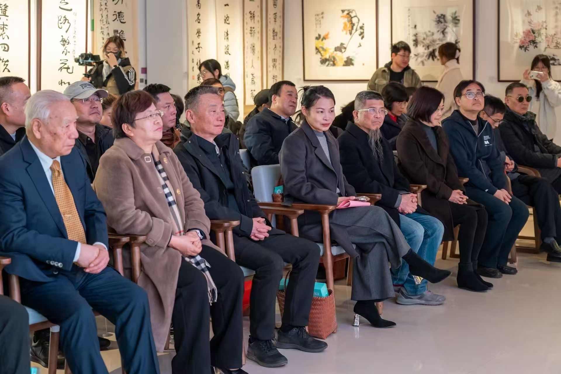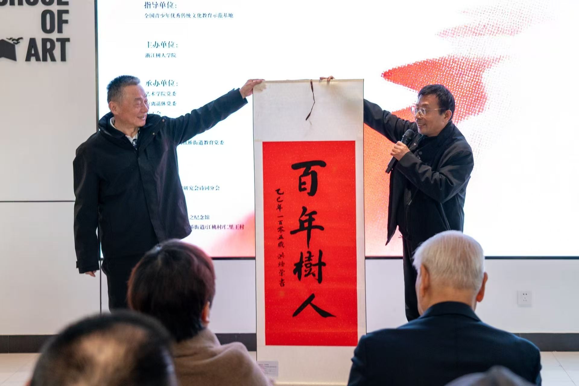 最后由百岁老师捐赠“百年树人”题词,由郭牧代为捐赠。学校党委书记王洪中代表学校,与郭牧共同举起105岁的洪焕荣先生的作品,向大家提出期望:“在新年到来之际,正是学校十五五新征程开局之年,让我们迈向新征程,继往开来,正名学校!”王洪中的话语让这幅作品成为连接过往与未来的精神纽带,也为整场展览注入了深刻的树人内涵。