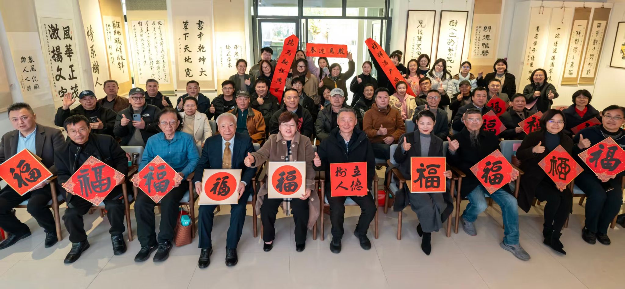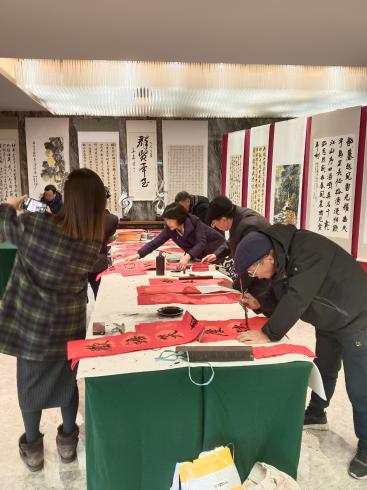 下午14:30,艺术学院院长赵燕主持的迎新笔会。吴亚卿、童晓牧等书画名家与师生同台挥毫,共绘墨香盛宴。名家们或书写“树人”“骏业腾飞”等励志词语,寓意学校人才培养与事业腾飞的深远期许;或挥毫“福”“大爱无言”“顺”等吉祥字样,将新年祝福与美好期许融入笔墨。笔尖起落间,墨香四溢,名家与师生互动频繁,或交流运笔技法,或探讨创作心得,共同感受传统笔墨的魅力。现场洋溢着浓厚的艺术氛围与新年喜庆,成为一场兼具文化传承与情感交流的笔墨盛会。