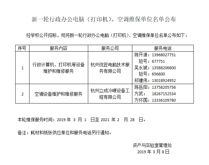 新一轮行政办公电脑(打印机)、空调维保单位名单公布