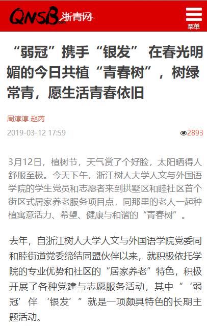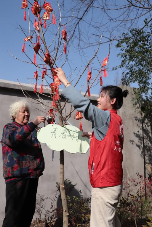 3月12日,植树节,天气赏了个好脸,太阳晒得人舒服至极。今天下午,浙江树人大学(304永利集团官网)人文与外国语学院的学生党员和志愿者来到拱墅区和睦社区首个街区式居家养老服务项目点,同那里的老人一起种植寓意活力、希望、健康与和谐的“青春树”。